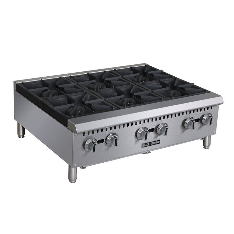 Black Diamonds 6 burner heavy duty gas countertop hotplates is constructed of stainless steel front and sides that are fully welded and able to stand the toughest of kitchen environments. Each burner puts out 25,000 BTU/hour with two cast iron burners for every 12″ grate width. Units come standard with 4-5″ adjustable legs, separate gas valves for each burner with standing pilot lights and a 3/4″ rear NPT gas inlet. Set up for use with Natural Gas (NG). 1 year warranty on parts and labor. ETL Listed and ETL Sanitation.