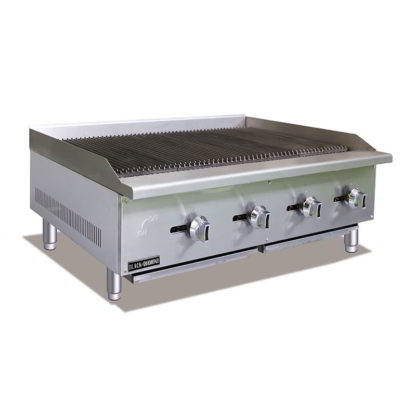 The Black Diamond BDECTC-48 countertop charbroiler is powered by natural gas, with the option to convert it to LP gas. Its bull-nose front acts as a protective cover for the control knobs, shielding them from accidental bump adjustments by users. Because the front, sides, and splash guards are constructed of scratch-resistant stainless steel, this unit can withstand intensive use during high-volume traffic.