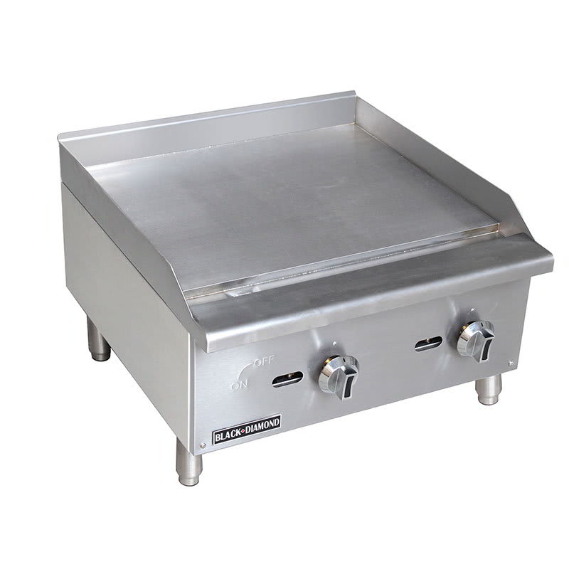 The Black Diamond BDECTG-24 gas griddle is equipped with manual controls protected by a bull-nose front. Its smooth, stainless steel plate can withstand repeated heating and cooling without warping for intensive, high-volume use. This griddle’s grease trough is 3 inches wide to expedite cleaning.