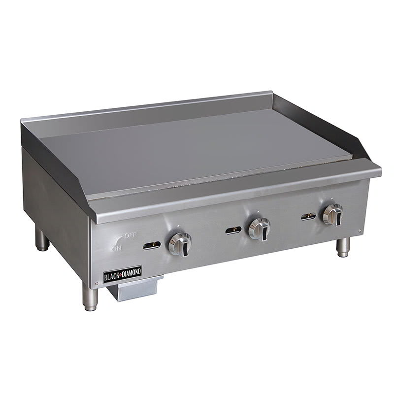 Black Diamond Griddle, countertop, 36″W x 26″D, 5/8″ thick smooth steel plate, (3) manual burner control, stainless steel drip tray, stainless steel front and sides, splash guards, grease trough, adjustable legs, includes tips for field conversion to LPG, 90,000 BTU, 3/4″ rear NPT, cETLus, ETL