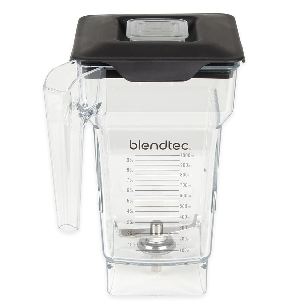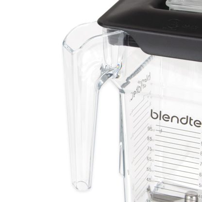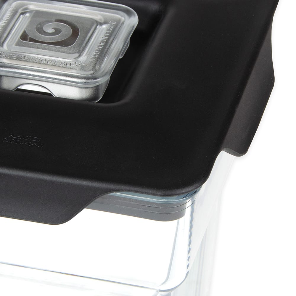 The Blendtec FOURSIDE-V FourSide blender jar has a 75-ounce capacity with measurement marks up to 32 ounces in ounces, milliliters, and cups. Since the jar is made of Tritan copolyester, it is resistant to bending and breaking. This material is clear, providing visibility while blending. With the vented lid, operators can add product through the insert. The Blendtec FOURSIDE-V