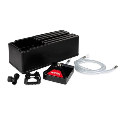 Rapid Rinser Station Complete Unit, magnetic switch, includes: Rapid Rinsersprayer & base, 6 ft. flexible nylon-reinforced tubing with 3/8″ compression fitting for water hook-up (minimum 30psi recommended), stainless steel nozzle, 120° spray nozzle coverage