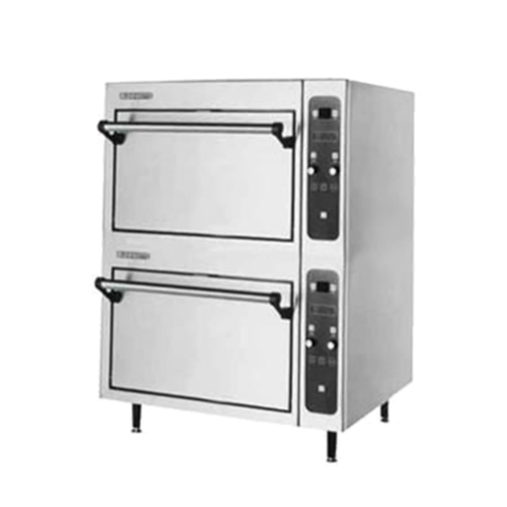 Oven, deck-type, electric, countertop, 20″W x 20″D, (2) 9″ high compartments, solid-state digital controls, Cordierite deck, crown angle trim, drop down type doors, includes stacking kit, stainless steel front, top and sides, 4″ stainless steel legs, (2) 3.75kW, cETLus, NSF