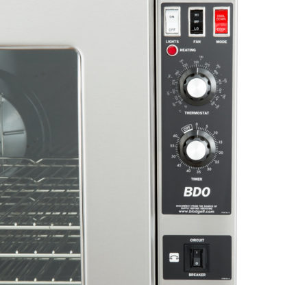 The oven has three tubular heaters that are controlled by a solid state thermostat with a temperature range from 200 to 500 degrees Fahrenheit, which gives you the ability to prepare a wide variety of products. For safety, the blower motor has an automated thermal overload protection mechanism and a control area cooling fan. It requires a 220/240V, 1 phase electrical connection.