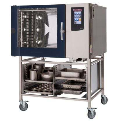 Combi Oven Steamer, gas, boilerless, (5) 18″ x 26″ full size sheet pan or (10) 12″ x 20″ full size hotel pan capacity, touch screen controls, multiple cooking modes, stores up to 500 recipes, external temperature probe, USB port, HACCP, automated CombiWash, glass door, door mounted drip tray, reversible (9) speed fan, 31-1/2″ tall stand with runners & adjustable feet, stainless steel exterior & interior, 81,800 BTU, cETLus, ETL-Sanitation, CE