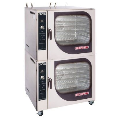 The Blodgett CNVX-14E double electric convection oven has 10 shelves with five located in each deck. Made of wire, air circulates evenly throughout the shelves to enable uniform heating. The ovens are mounted on 4-inch casters to provide mobility through the kitchen. To offer humid cooking, this unit utilizes Hydroburst technology; a condensate trough contains steam condensate to prevent it from falling out when the doors are opened. The doors are latched with an integral switch so they aren’t opened during operation.