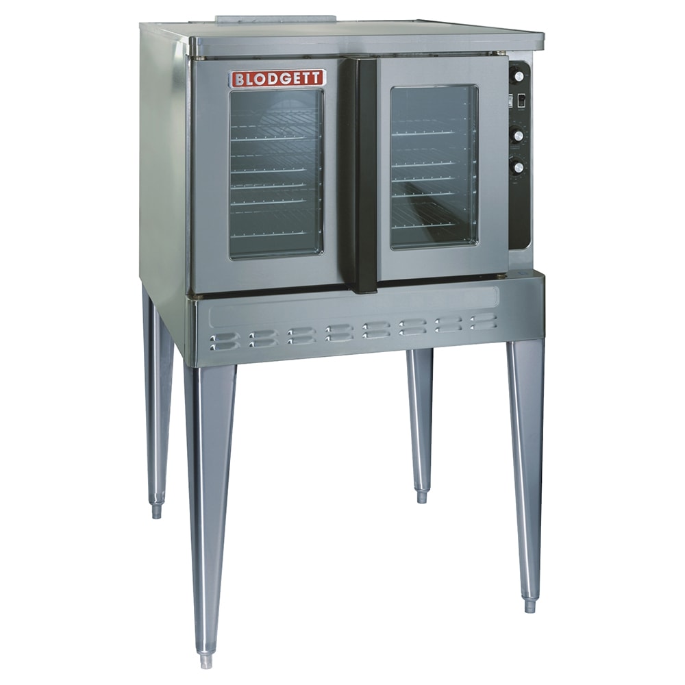Convection Oven, single-deck, standard depth, capacity (5) 18″ x 26″ pans, (SSD) solid state digital controls, 2-speed fan, interior light, simultaneous operated doors with glass, stainless steel front, sides & top, 6″ stainless steel legs & stacking kit, flue connector, 1/2 HP, 55,000 BTU, CSA, NSF, CE