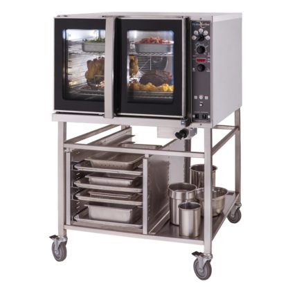HydroVection Oven, Gas, full size, (base oven only) capacity (5) 18″ x 26″ pans, (3) inshot burners, direct spark ignition, black glass doors, (2) halogen lamps, (5) stainless steel racks and (10) rack positions, cavity vent, programmable manual controls with hot air, humidity & cool down functions, four speed auto-reversing fan motor with overload protection, 4″ fillet core probe & USB connection, side mounted hand shower, 304 stainless steel insulated interior liner, stainless steel front, top, sides & back, 3/4 HP, 60,000 BTU, cETLus, NSF
