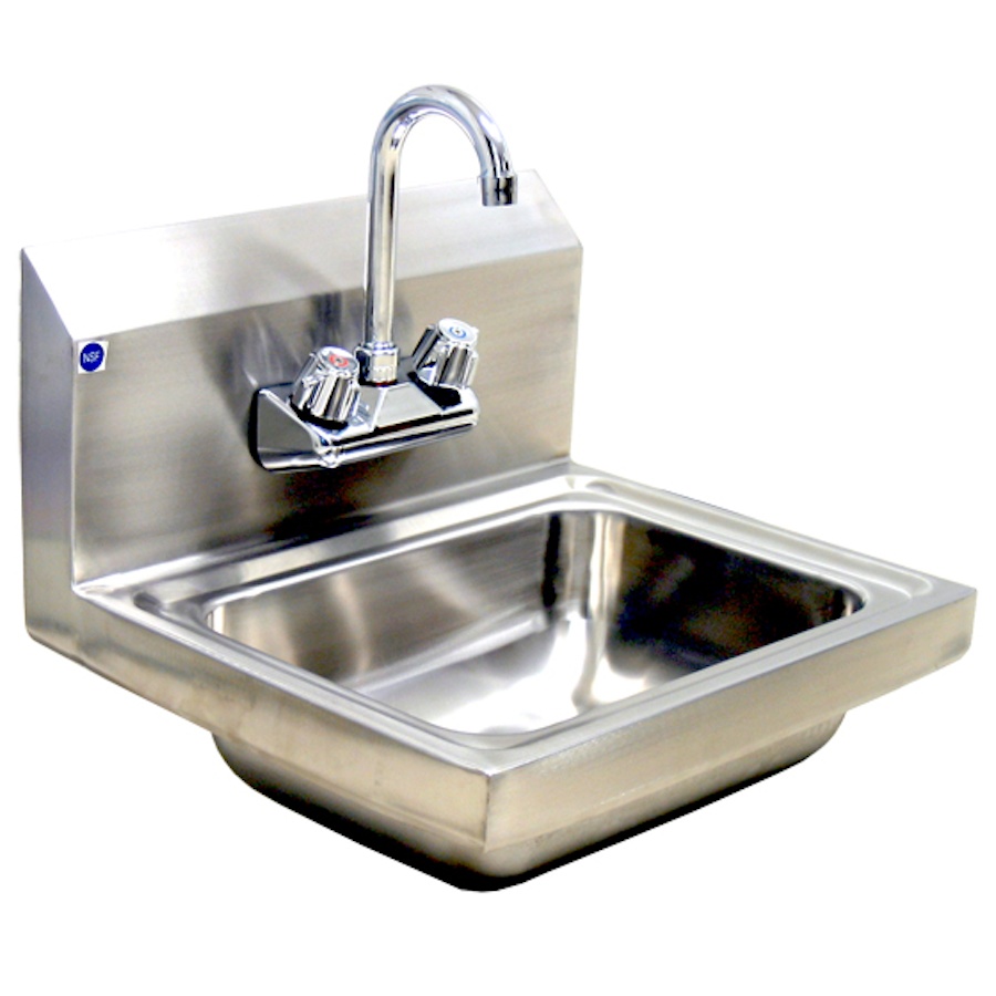 Hand Sink, one compartment, 10″ front-to-back x 14″Wide x 5″ deep bowl, 18/304 stainless steel, with lead free faucet, drain basket, NSF