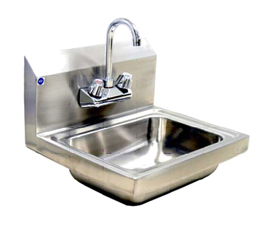 Hand Sink with Splash Guard, one compartment, 10″ front-to-back x 14″Wide x 5″ deep bowl, 18/304 stainless steel, with lead free faucet, drain basket, NSF