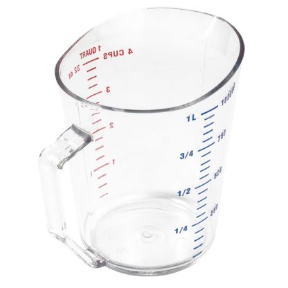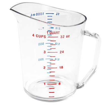 The Cambro 100MCCW135 Camwear measuring cup has a 1-quart capacity. The external standard and metric graduation markings simplify measuring liquid. The handle is molded into the cup, so it is comfortable and will not easily break off. Made of polycarbonate, the Cambro 100MCCW135 Camwear measuring cup is durable for resisting bending and breaking. Since this material also resists denting, it ensures that the measurement is always accurate.