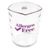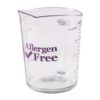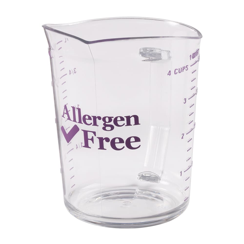 The Cambro 100MCCW441 Camwear measuring cup can be used to prepare dishes for those with food allergies, and works best when stored away from common allergens such as nuts, fish, and eggs. An allergen-free logo is printed on the cup and measurement marks are purple to contrast with regular measuring tools. It can accommodate 1 quart of dry food and ingredients can be poured out of the lip, which is sloped to prevent splatter. This cup is made of durable, break-resistant polycarbonate and has a sturdy handle with a thumb hold. It can be cleaned by hand or in the dishwasher with other allergen-free tools.