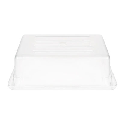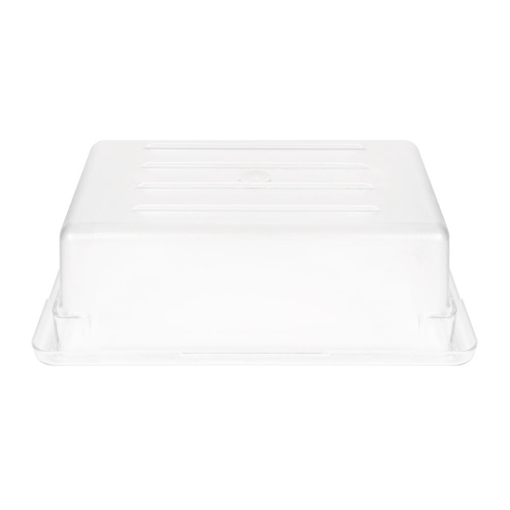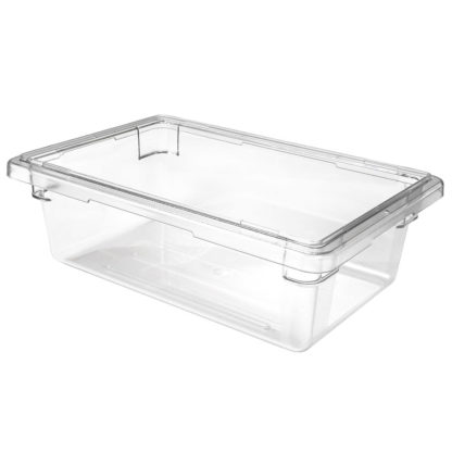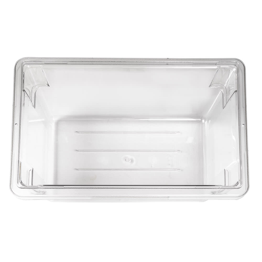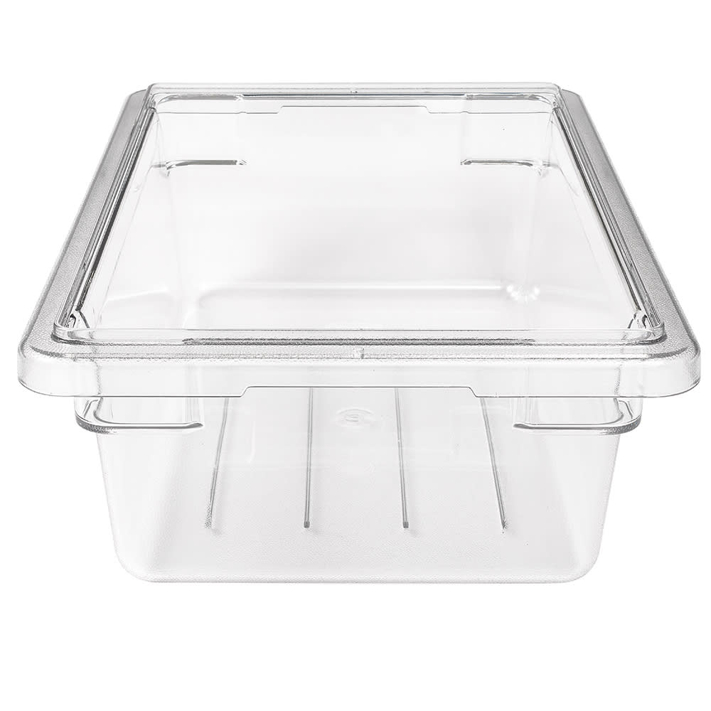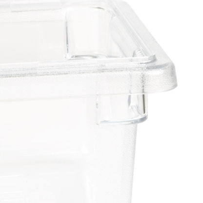 The Cambro 12186CW135 Camwear food storage container is made of polycarbonate and resists bending, breaking, and chipping. Transferring product from cardboard boxes to this container reduces the risk of contamination, and since the material is clear, staff can see inside for inventory checks. Its smooth sides facilitate cleaning, while its textured bottom resists scratching and slipping.