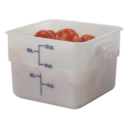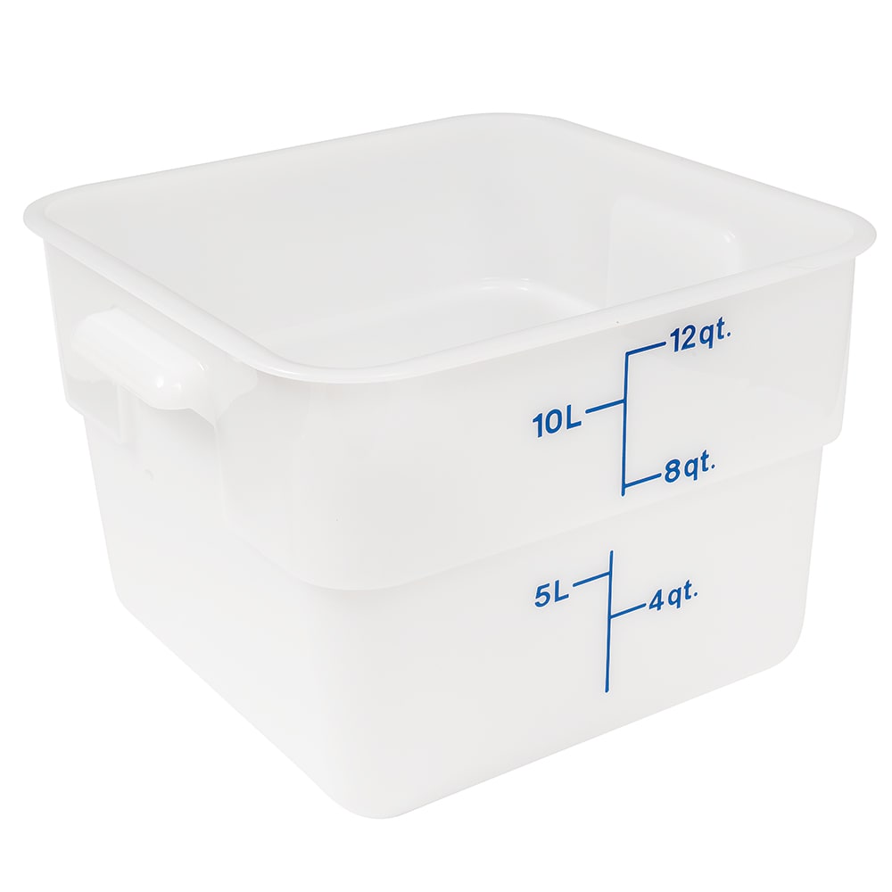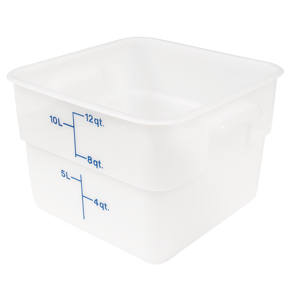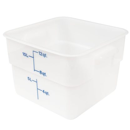 The Cambro 12SFSP148 CamSquare food storage container is made of stain-, impact-, and chemical-resistant polycarbonate with a 12-quart capacity. Graduations are printed in a large font on the exterior for quick identification. It can withstand temperatures from -40 to 160 degrees Fahrenheit and is dishwasher safe.
