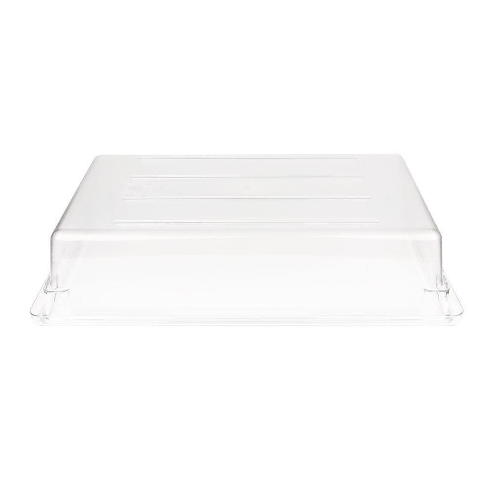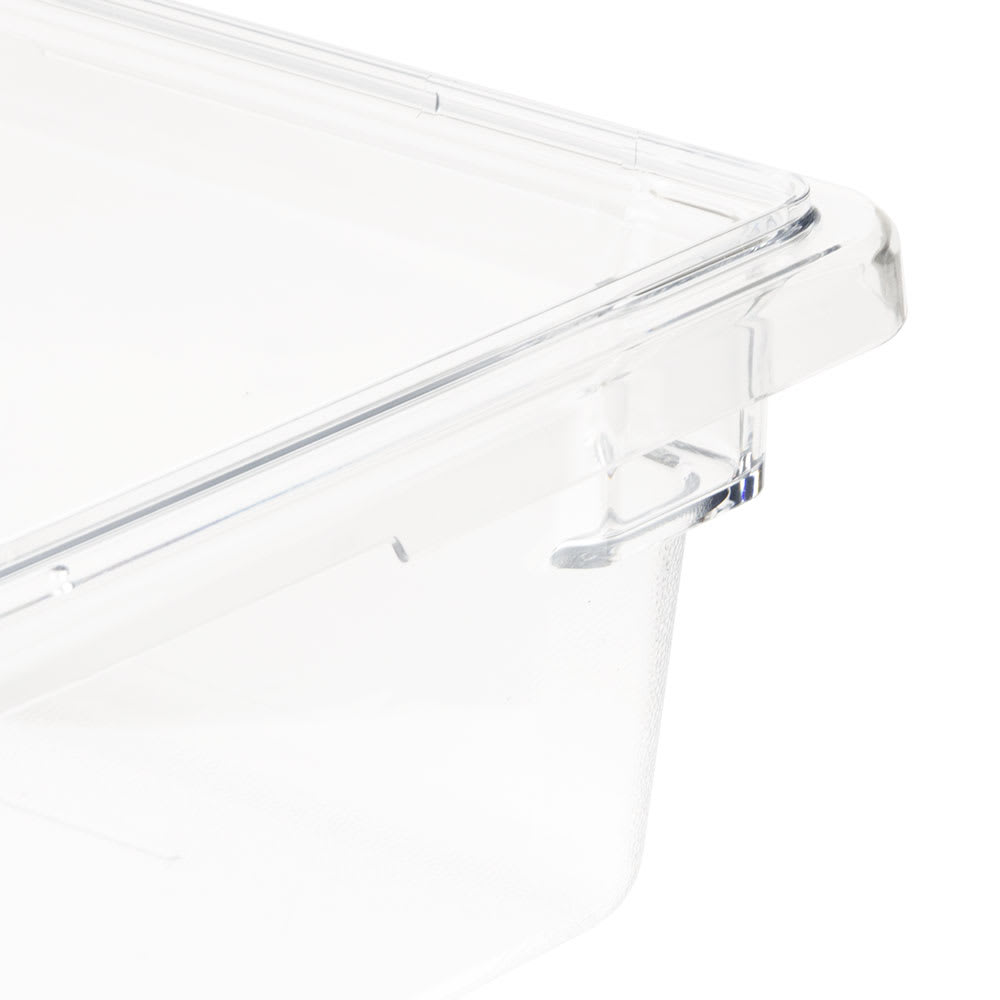 The clear Cambro 18266CW135 Camwear food storage container provides product visibility for inventory checks. Most of its surfaces are smooth, so the box cleans quickly, and the textured finish on the bottom resists slipping or scratching. Since the container is made of polycarbonate, it can endure heavy use.