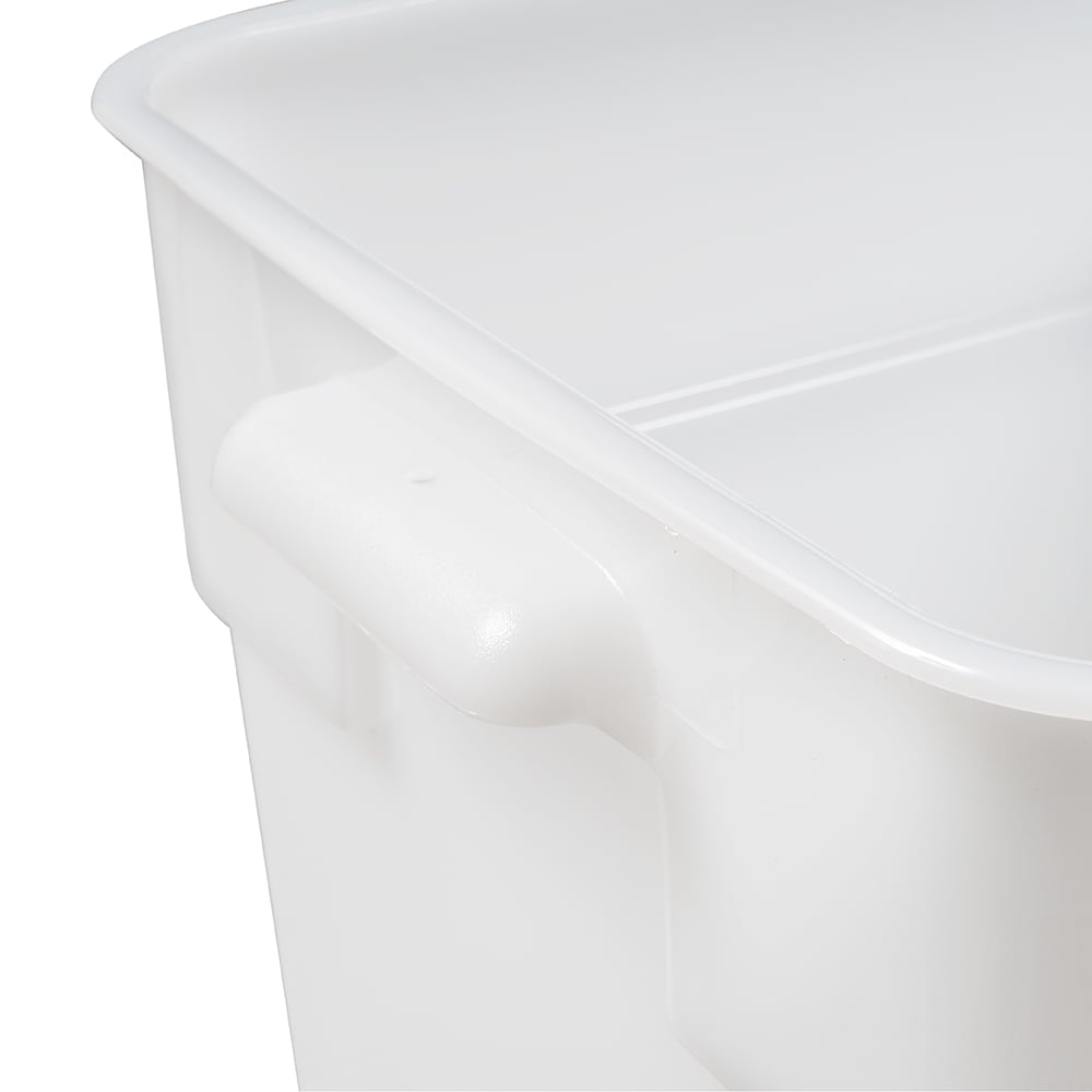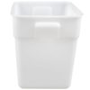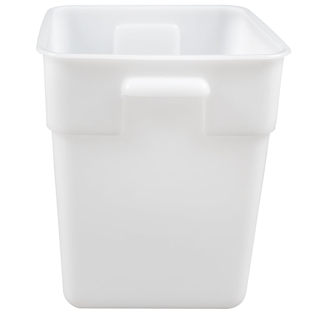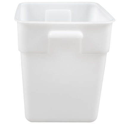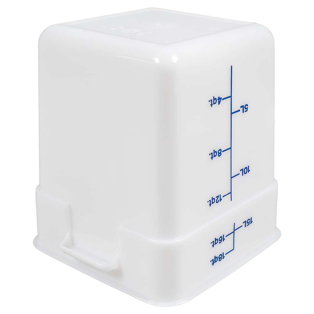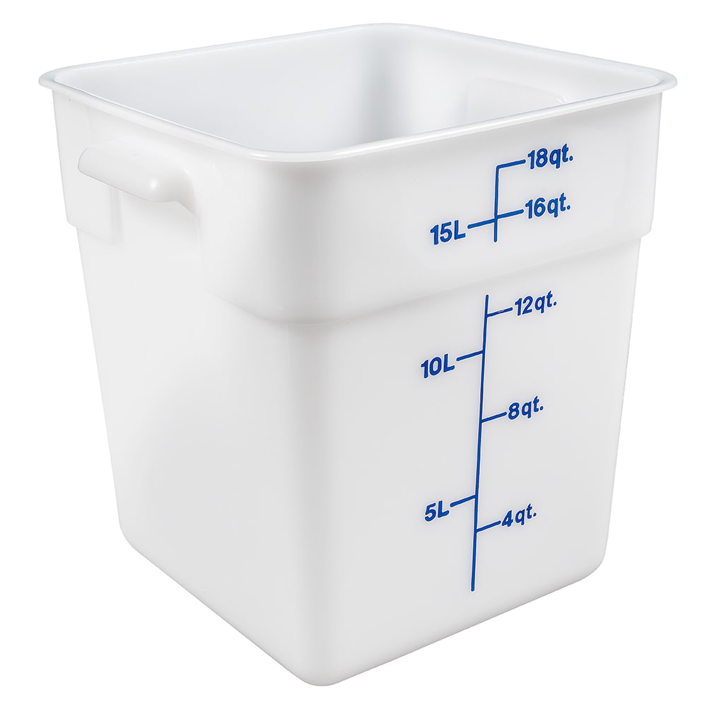 The Cambro 18SFSP148 CamSquare food container has an 18-quart capacity and is made of impact-, chemical-, and stain-resistant white polyethylene. It has graduations printed on the side for quick identification and is stackable to maximize space. It is dishwasher safe and withstands temperatures from -40 to 160 degrees Fahrenheit.