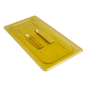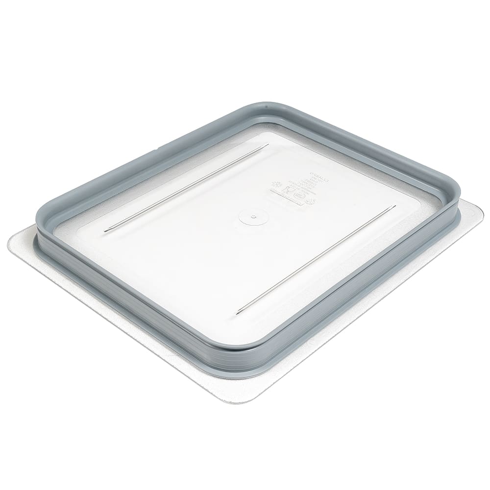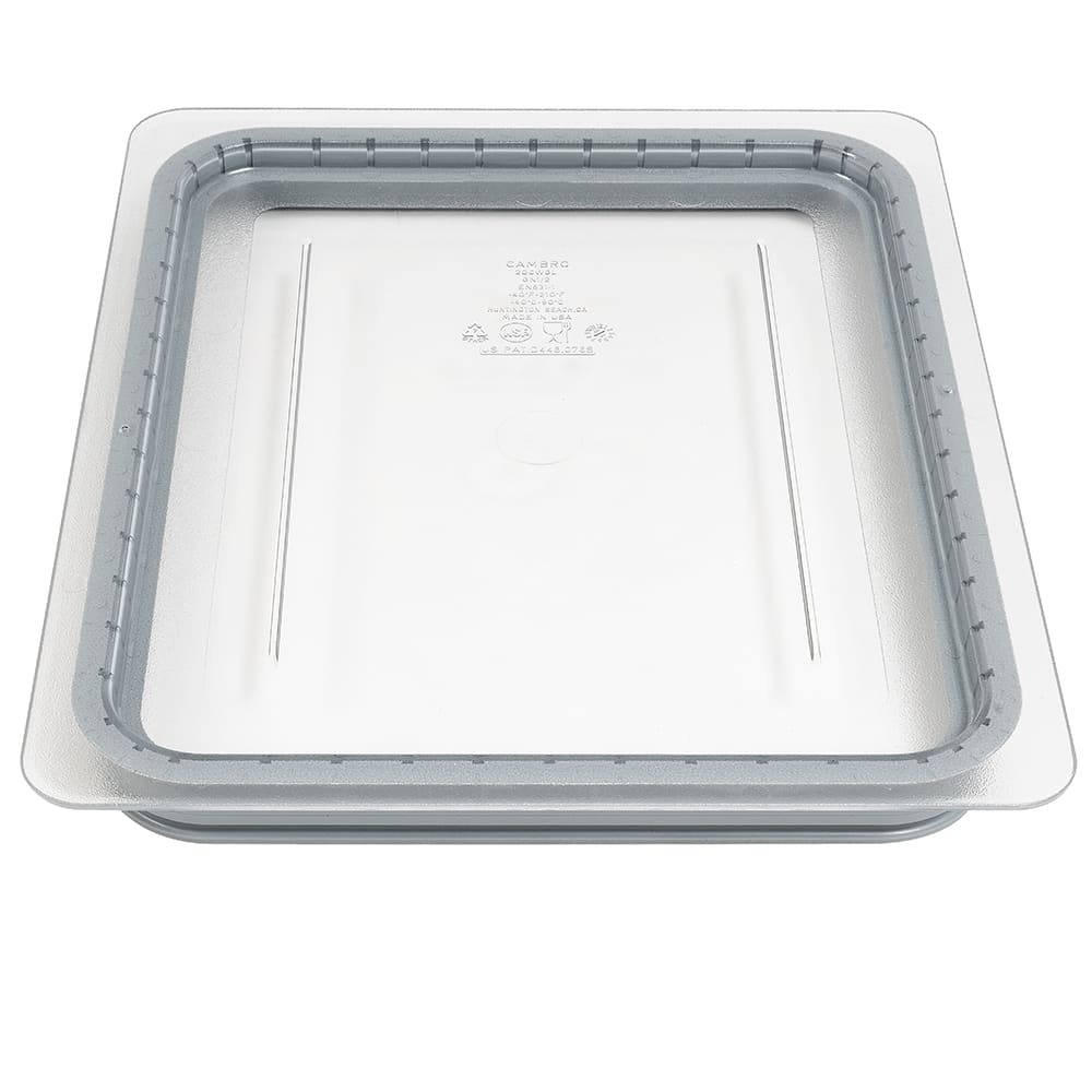 The Cambro 20CWGL135 Camwear GripLid half-size food pan cover has a polycarbonate construction with a polyurethane gasket to create a seal around the pan. It can fit any half-size pan and is dishwasher safe.