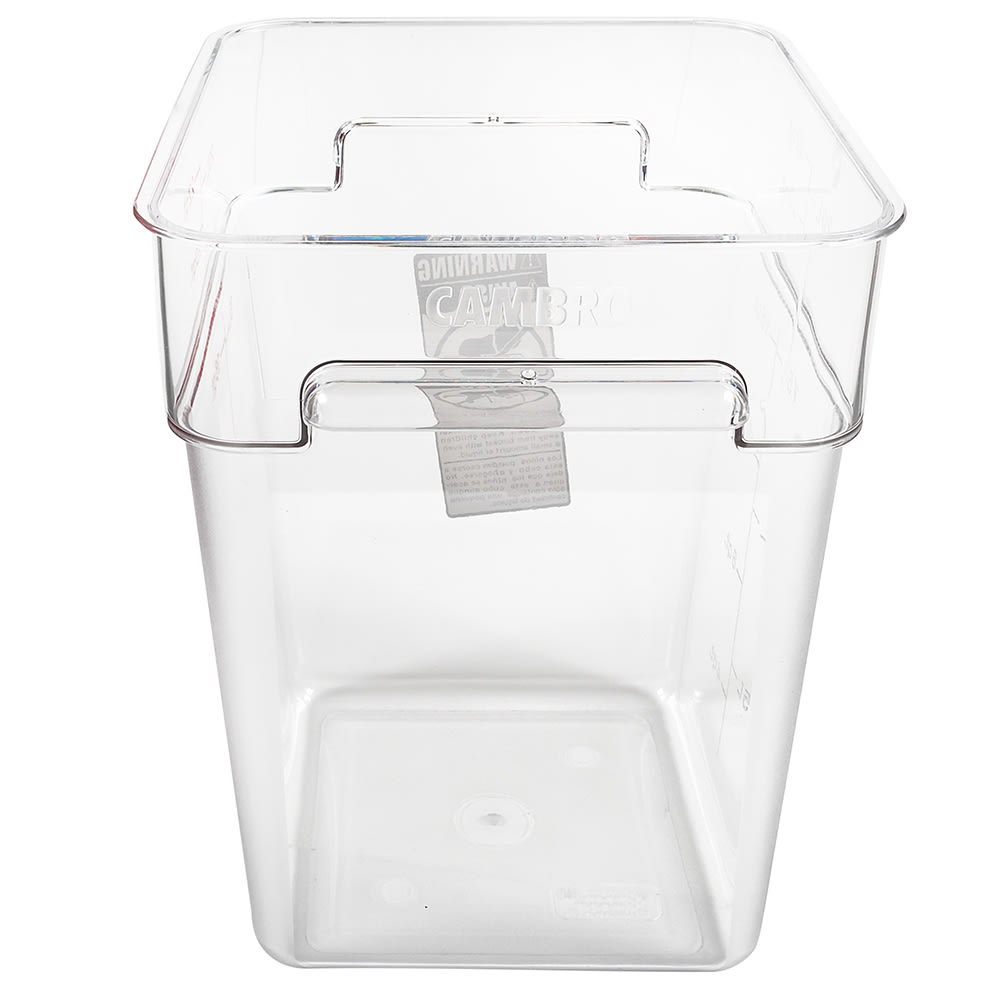 The Cambro 22SFSCW135 Camwear CamSquare food container is made of polycarbonate, a material that resists minor damage, stains, and odors. Its material is clear, so staff members can see inside the container. With the built-in graduations, portioning and prepping product is simple. The square shape is a better fit on shelves than round containers. Measuring 111/4 inches long by 121/4 inches wide by 153/4 inches tall, the Cambro 22SFSCW135 Camwear CamSquare food container has a 22-quart capacity. Carrying the dish is simple with its wide molded-in handles, and holes in the handles enable water to drain properly.