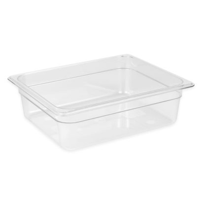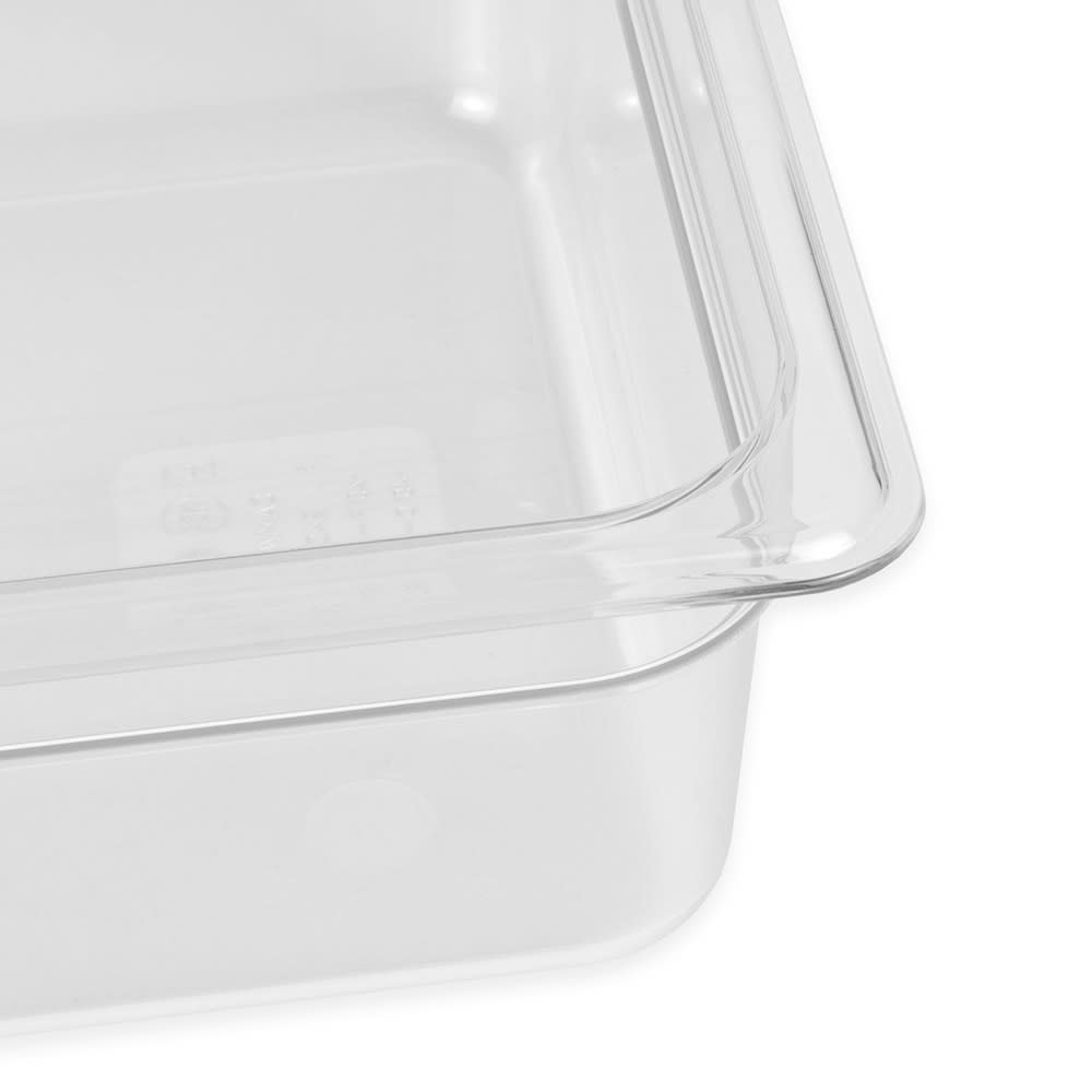 The Cambro 24CW135 Camwear half-size food pan has a 6.3-quart capacity and has molded-in graduations that help employees monitor inventory. The container is made of clear polycarbonate that is heavy duty and break resistant. Its interior is nonstick and smooth so it is easy to clean. It fits into most cold food wells with its uniform 1/2-inch flange.