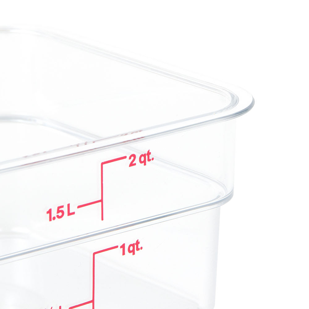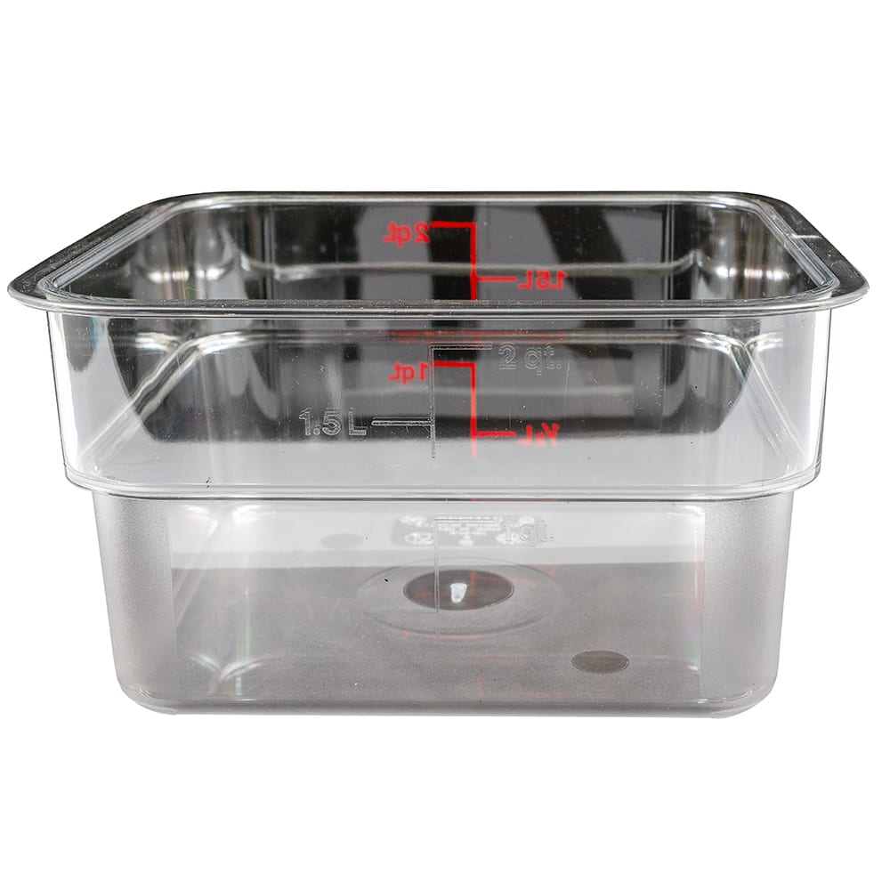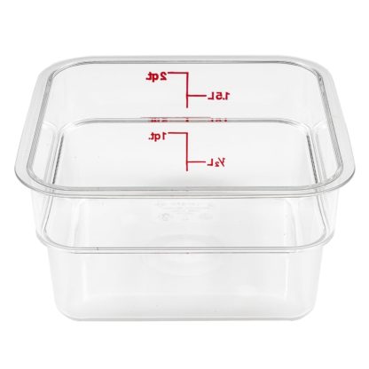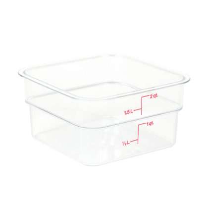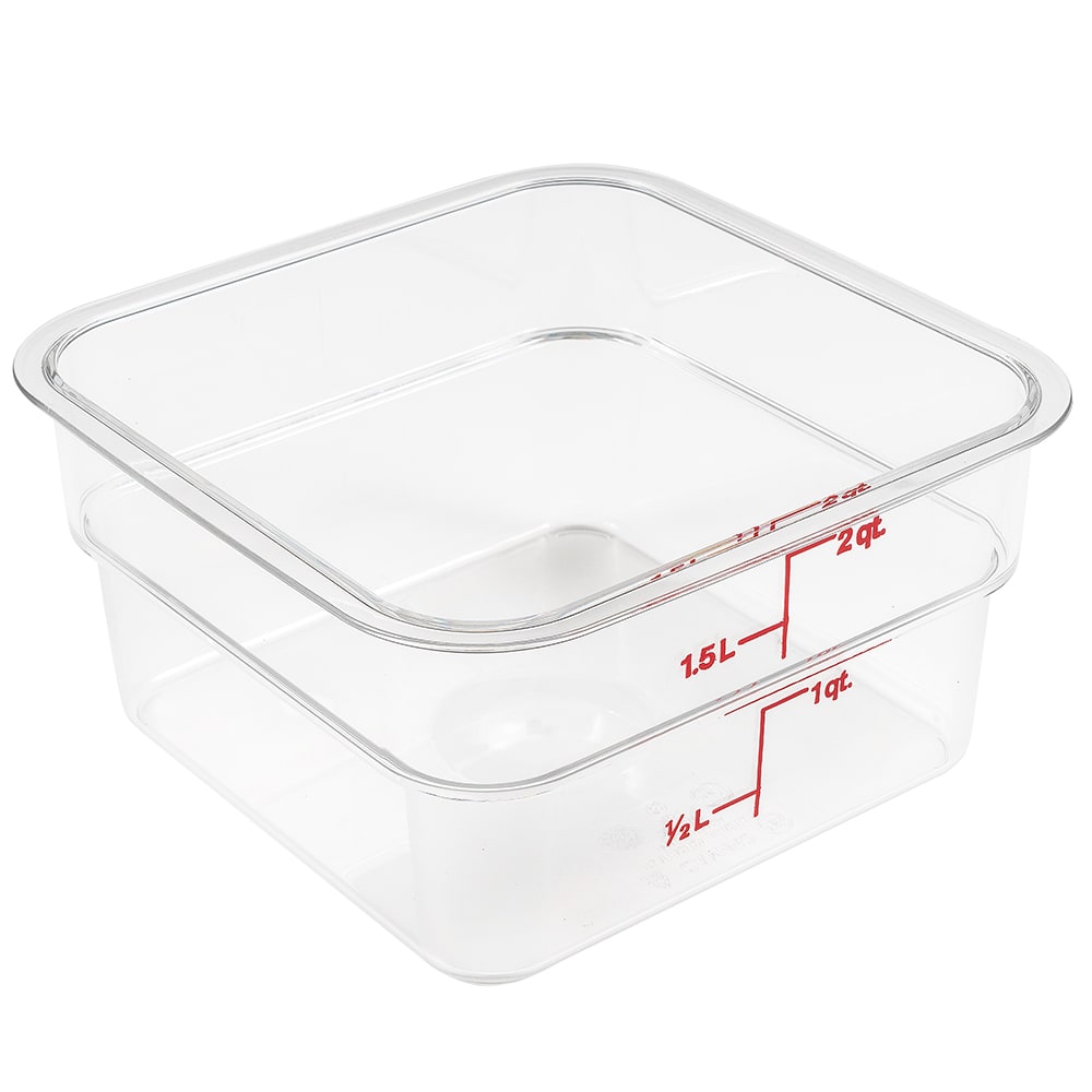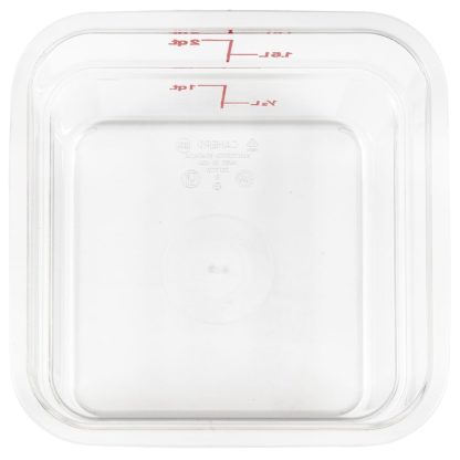 The Cambro 2SFSCW135 Camwear CamSquare food container is made of polycarbonate, which is resistant to breaking, staining, and odor retention. This material is crystal clear, so staff members can see inside the container, while its measurement graduations enable users to monitor product and check inventory. Molded-in handles with a wide design make it easy to grab and lift. The Cambro 2SFSCW135 Camwear CamSquare food container accommodates up to 2 quarts of product. Its square shape is more practical than round containers on shelves, and it can be stacked with other dishes to maximize space.