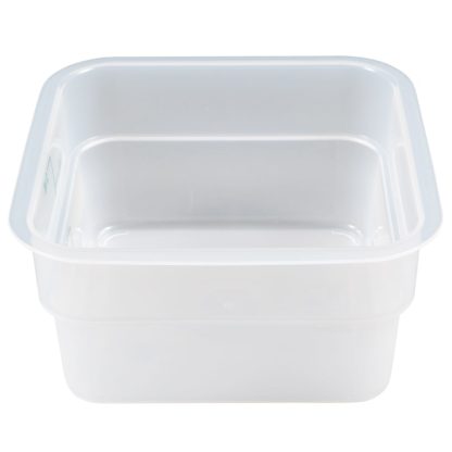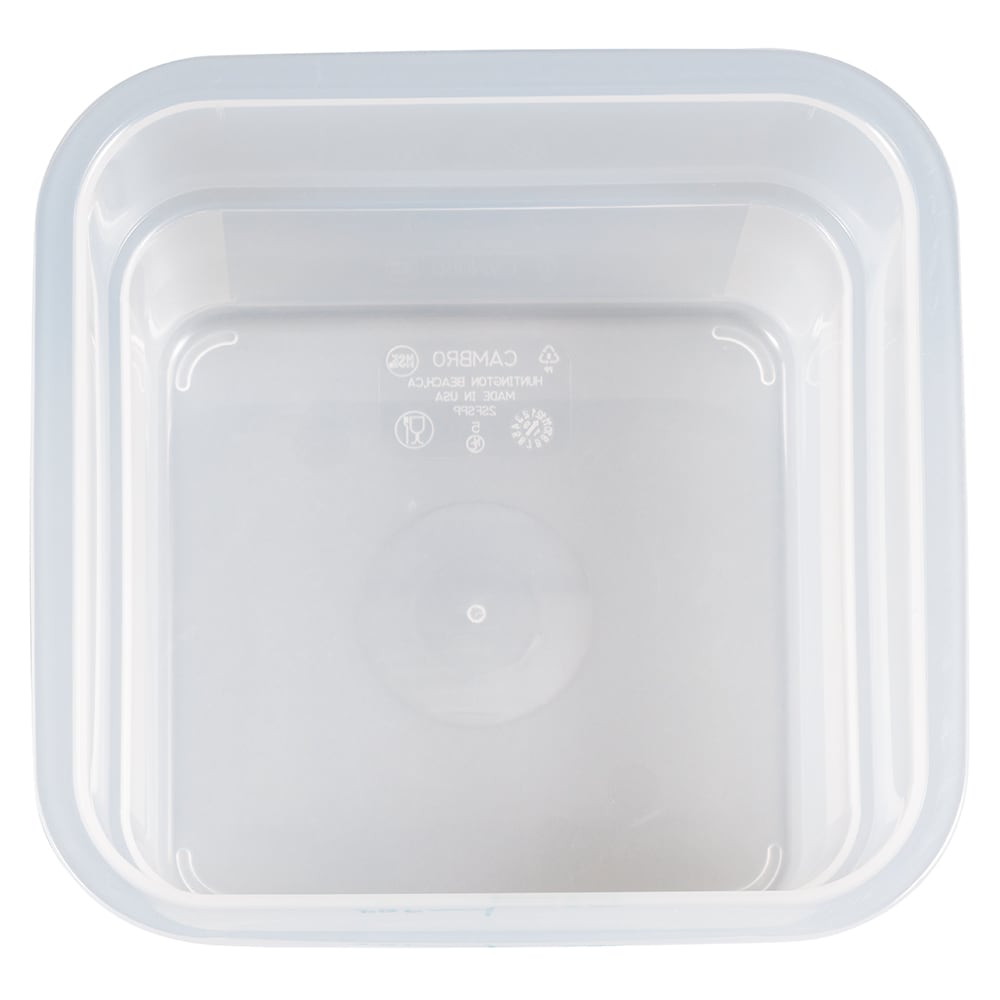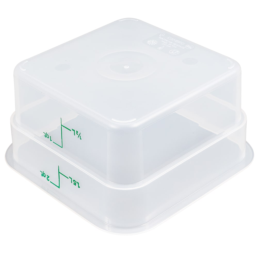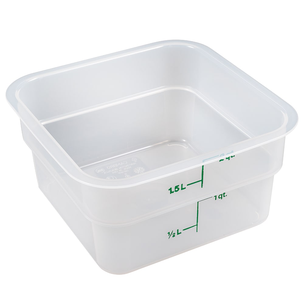 The Cambro 2SFSPP190 CamSquare square food container has a 2-quart capacity and is made of durable polypropylene. Graduations on the exterior enable the user to measure product efficiently. It can endure temperatures from -40 to 160 degrees Fahrenheit and is dishwasher safe.