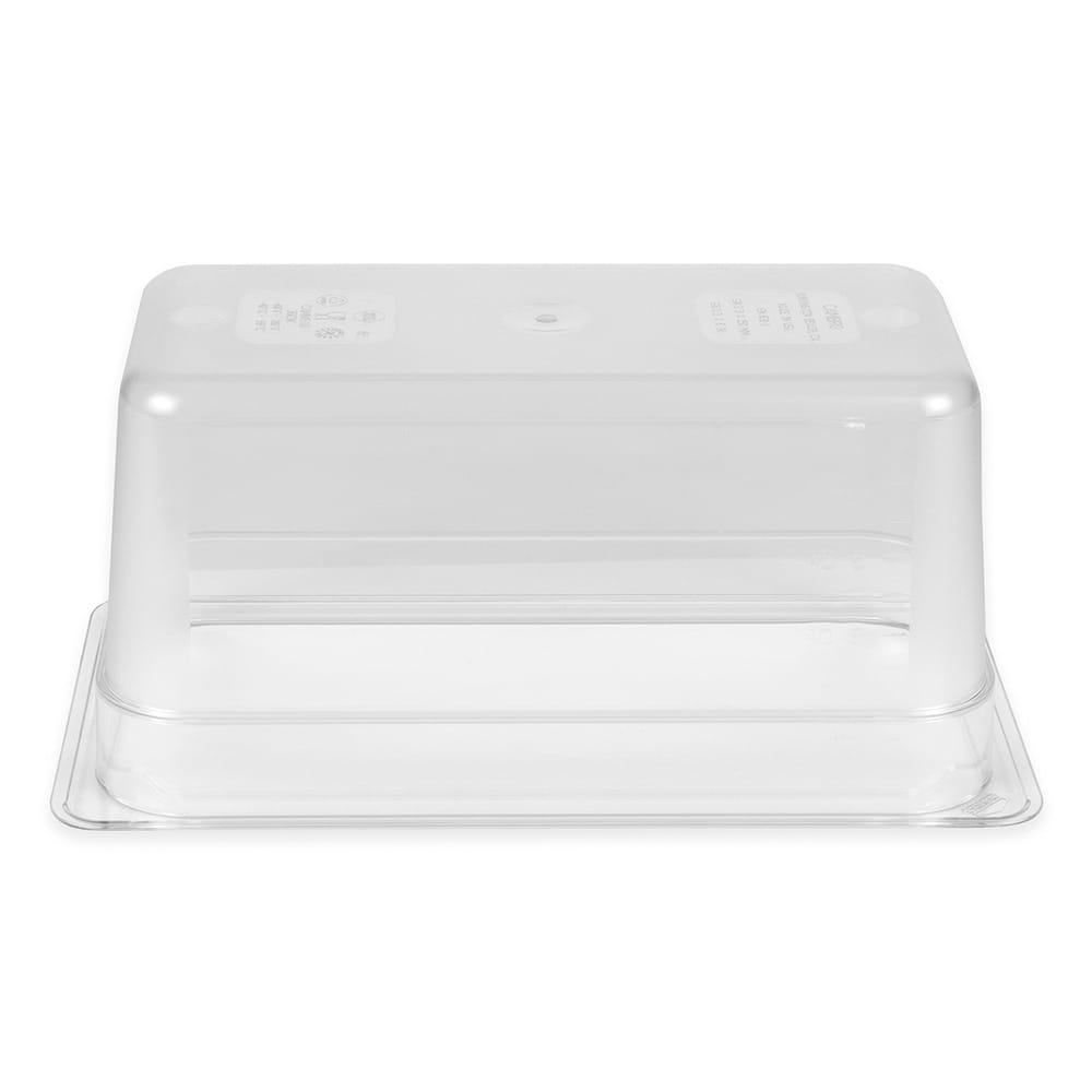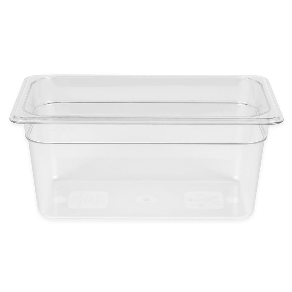 The Cambro 36CW135 Camwear third-size food pan fits in most prep tables and food bars with its uniformly designed, 1/2-inch flange. Since it’s made of polycarbonate, the pan is heavy duty. It’s clear so staff can see the food stored inside the pan. The interior surface is smooth and nonstick, which makes it easy to remove product, reduces waste, and simplifies cleanup. This third-size food pan can be stacked inside other pans without jamming.