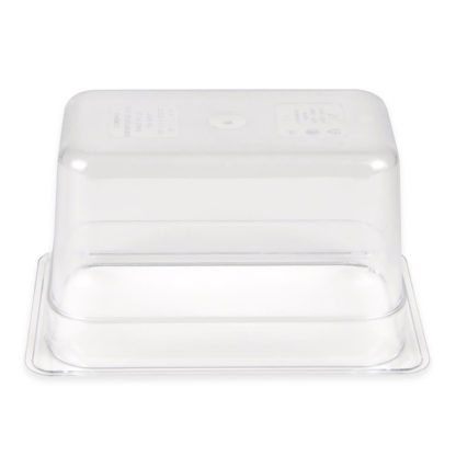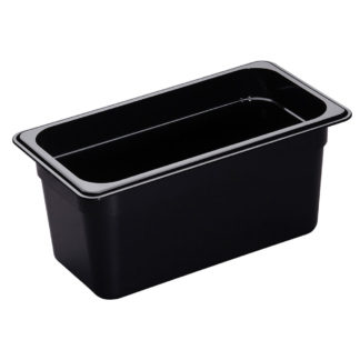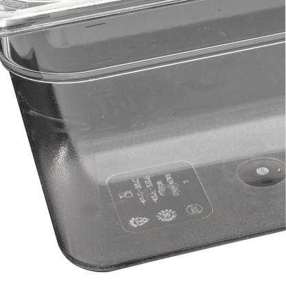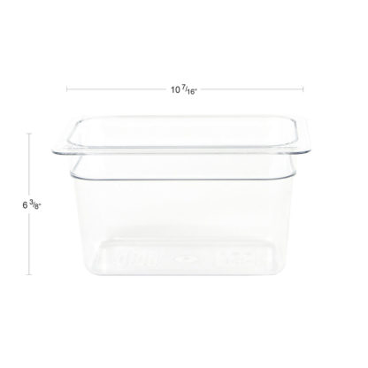 Made of polycarbonate, the Cambro 46CW135 Camwear food pan is break resistant and safe at temperatures between -40 and 210 degrees Fahrenheit. With this construction, the pan can be used for refrigerated storage. It keeps contents as cold as metal pans without high volumes of condensation. This quarter-size pan has a 6-inch depth, which provides space to hold 3.9 quarts of food. Operators can track the pan’s contents by checking the molded-in standard and metric measurement markings. Its interior has a smooth, nonstick design that streamlines the cleaning process and increases product yields.