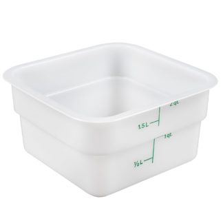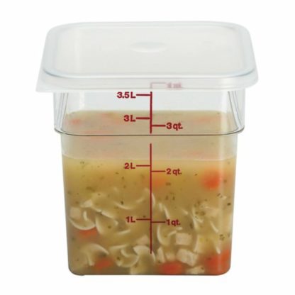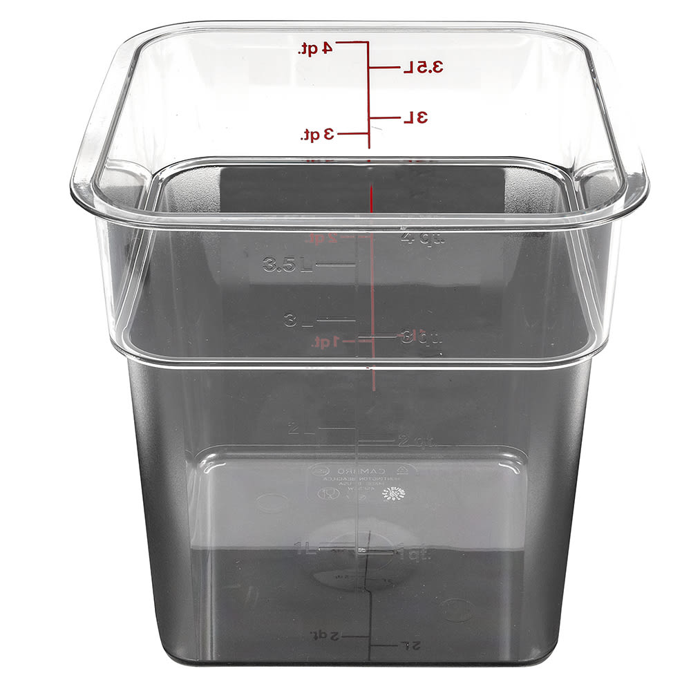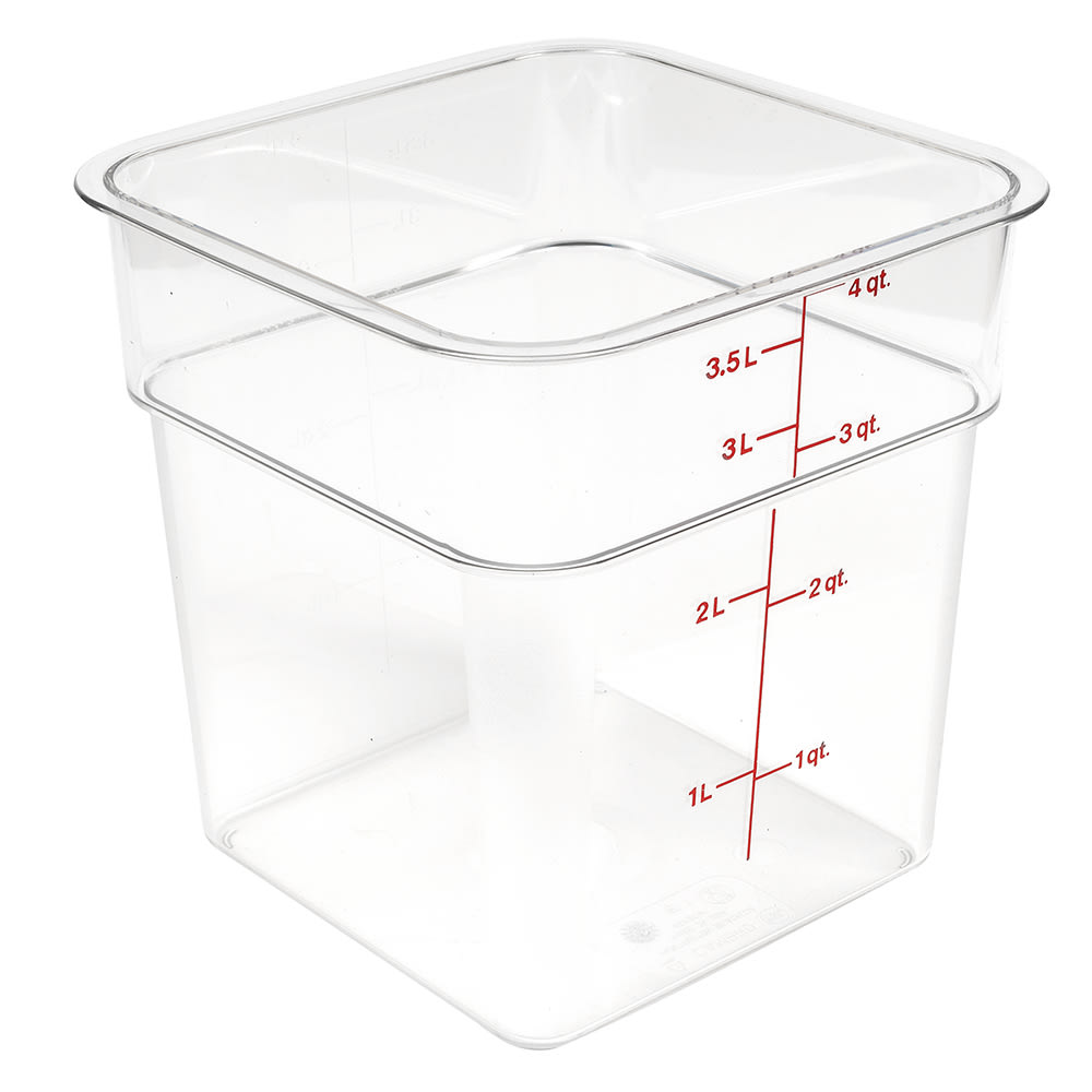The Cambro 4SFSCW135 CamSquare Camwear food container has a 4-quart capacity that is marked in red graduations for easy inventory checks. Its clear material makes it easy to identify product. Odors and stains are resisted with its material, and it is stackable with other containers to save space. The Cambro 4SFSCW135 CamSquare Camwear food container withstands temperatures from -40 to 210 degrees Fahrenheit.