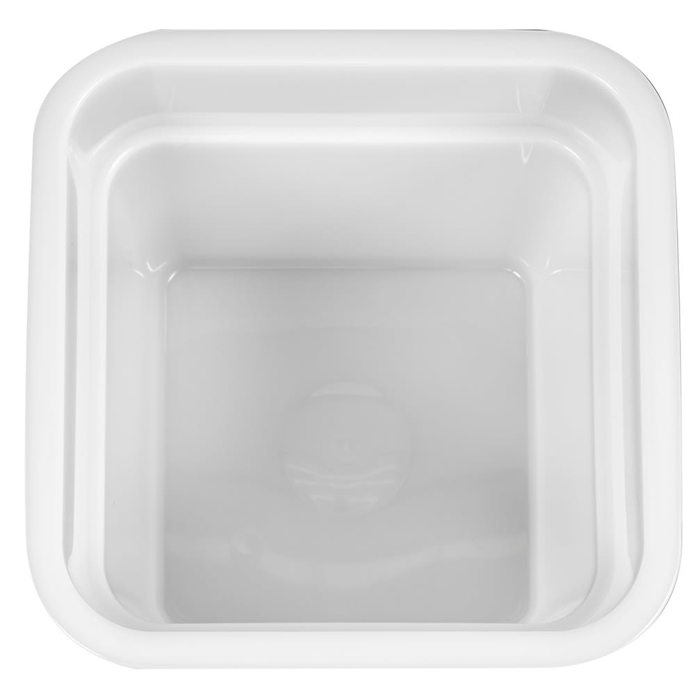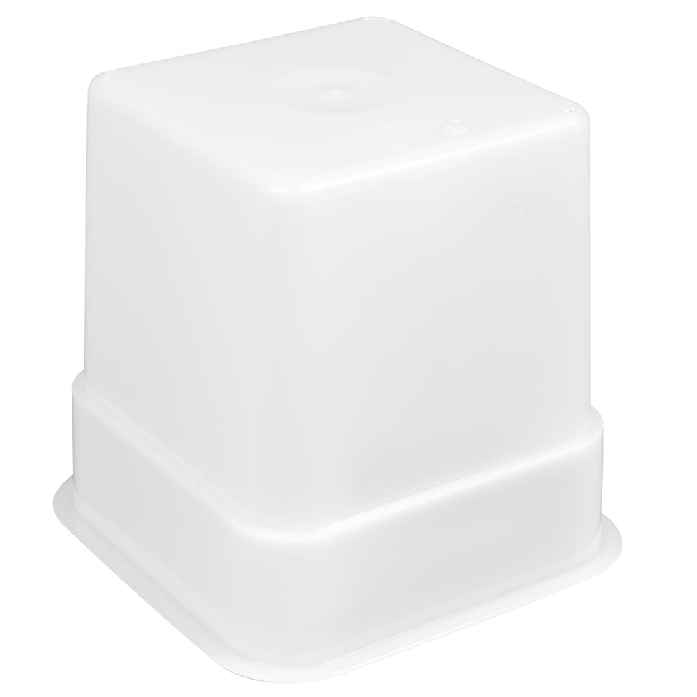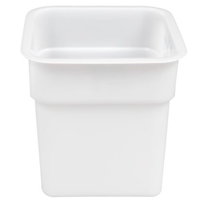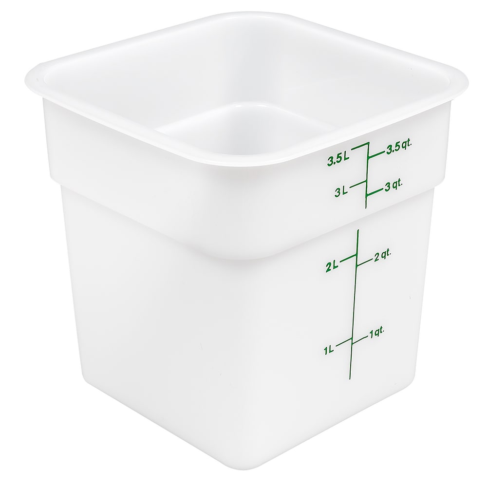 The Cambro 4SFSP148 CamSquare food container has a 4-quart capacity and is made of white polyethylene. It has 33 percent more capacity than round containers and resists odors, stains, and acids. It is stackable to maximize space and has green graduations on the outside for quick identification.