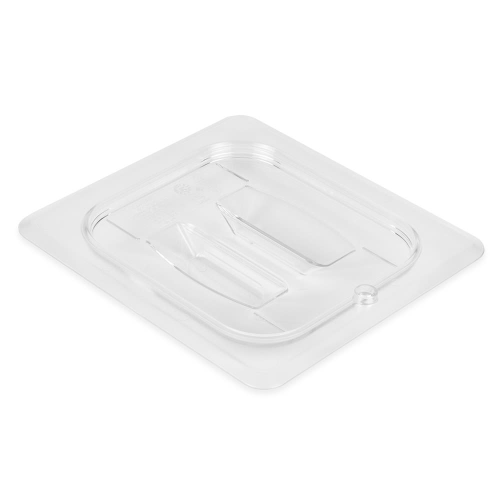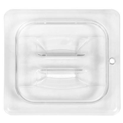 The Cambro 60CWCH135 Camwear sixth-size food pan cover is made of clear polycarbonate that endures temperatures from -40 to 210 degrees Fahrenheit. It fits any sixth-size food pan and can be stacked to maximize space. A handle provides a comfortable, safe grip, and a peg hole enables hang drying. This food pan cover should not be used with steam tables or microwaves.