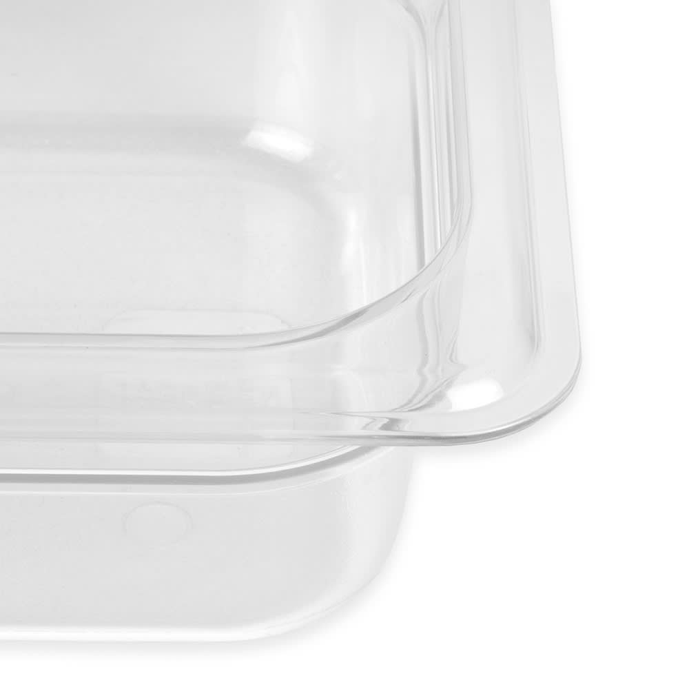 The Cambro 62CW135 food pan is made of clear polycarbonate, which enables users to see the food stored inside. Its stackable shape conserves space, while its nonstick surface and rounded corners reduce food waste. Resisting bending and denting, the sturdy plastic holds as many as 1.1 quarts of ingredients.