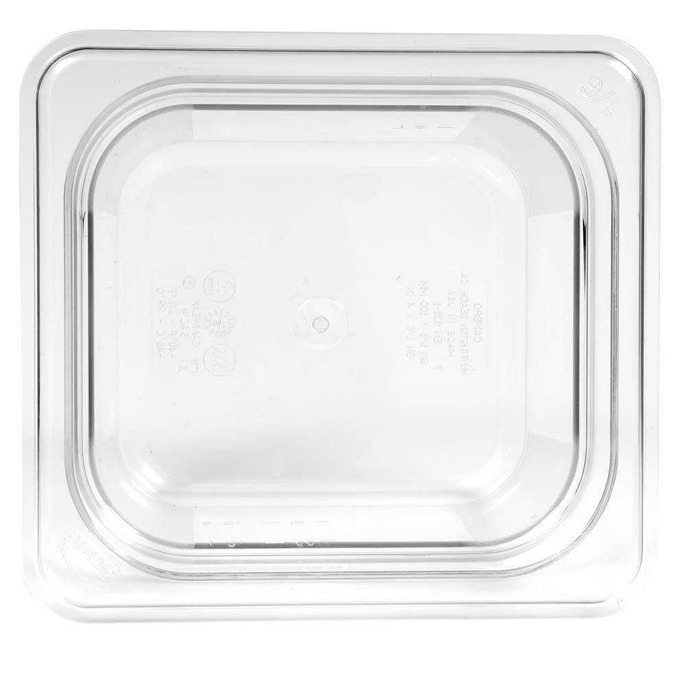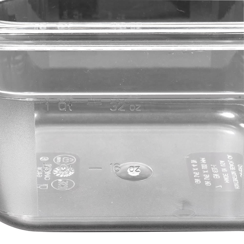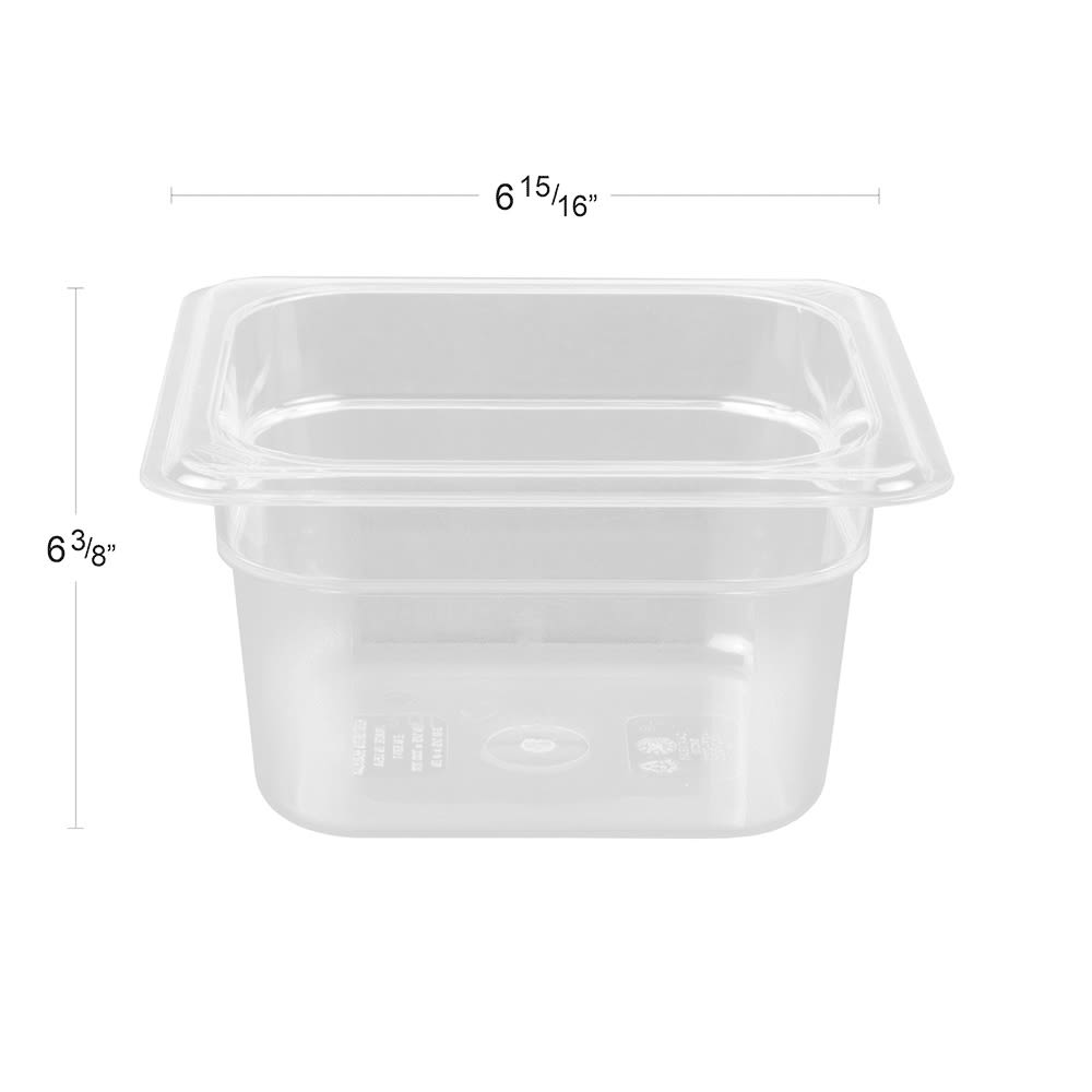 The Cambro 64CW135 Camwear sixth-size food pan has a 1.6-quart capacity and polycarbonate construction that resists bending, cracking, and denting. Its clear material provides visibility for inventory checks, and outside graduations enable quick identification. Its textured bottom reduces sliding and scratching, while the nonstick interior eases cleaning. It endures temperatures from -40 to 210 degrees Fahrenheit and can be stacked to save space.