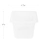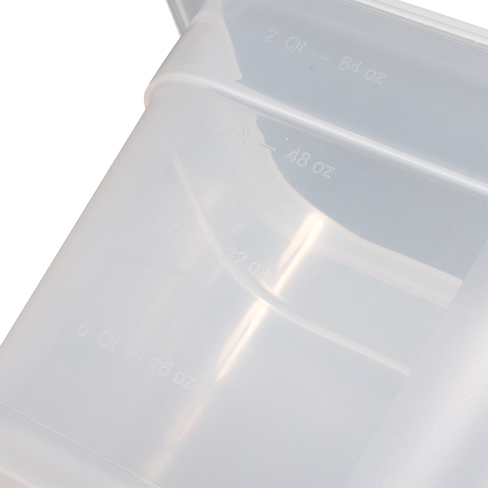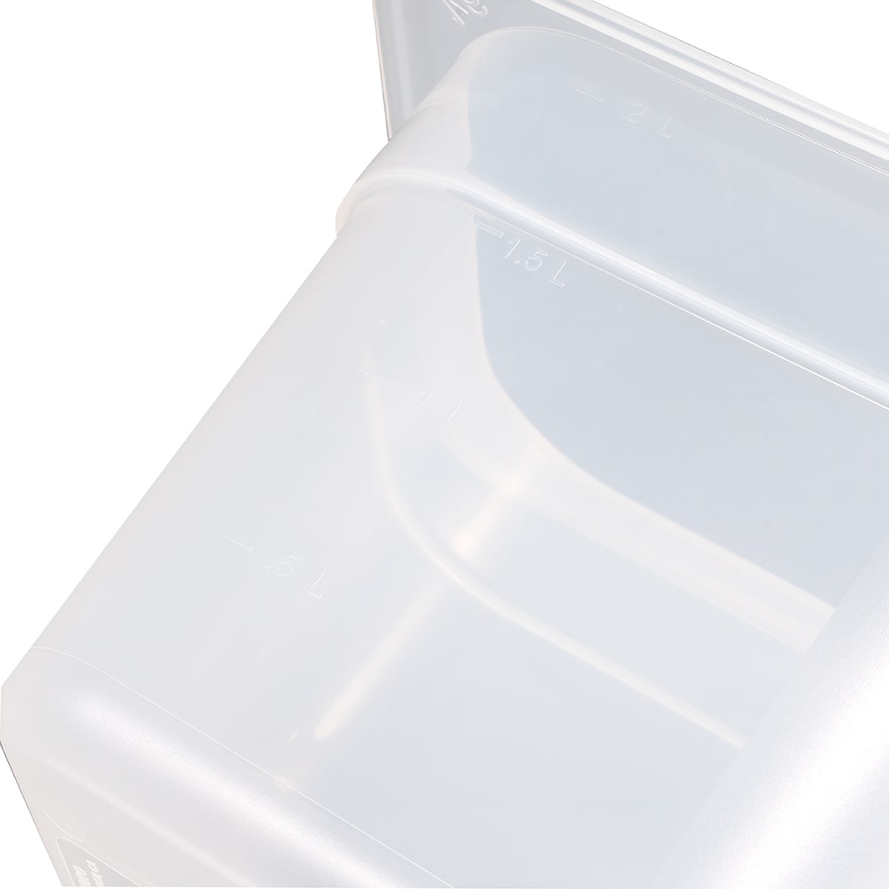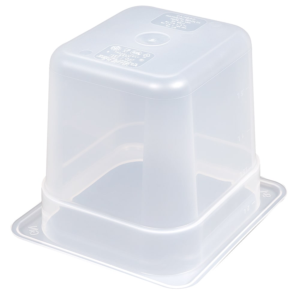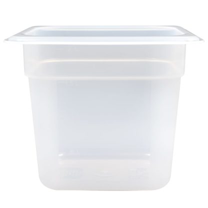 The Cambro 66PP190 food pan is translucent, making food visible. Graduation markings help employees keep up with inventory. This pan is stackable with other pans and resists chemicals. It holds 2.4 quarts of product, and its smooth interior releases food easily. Constructed of polypropylene, the pan resists bending and breaking.