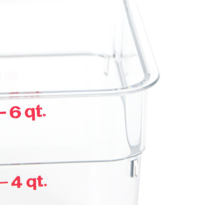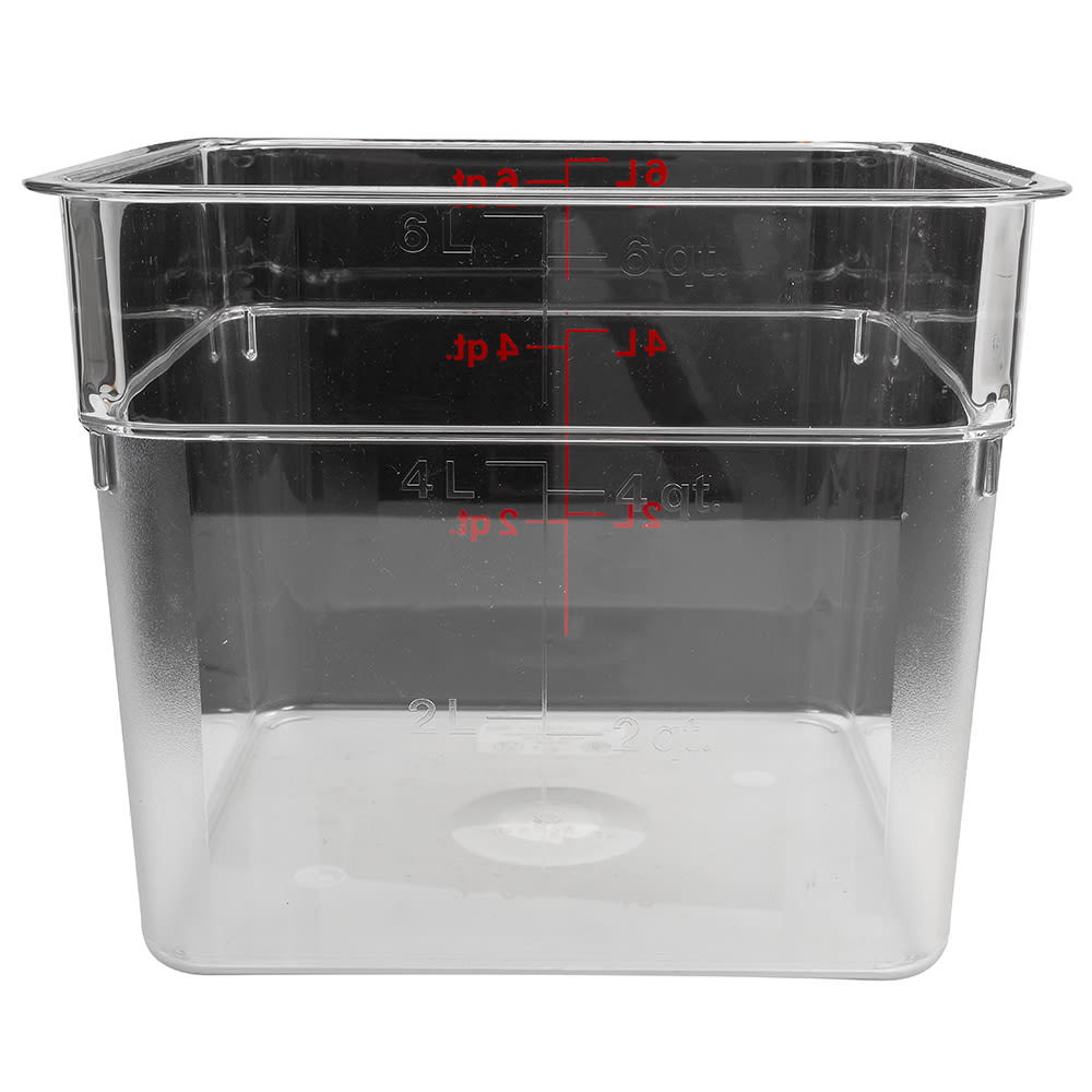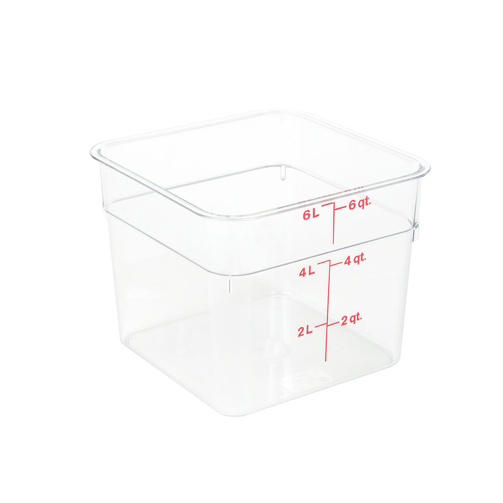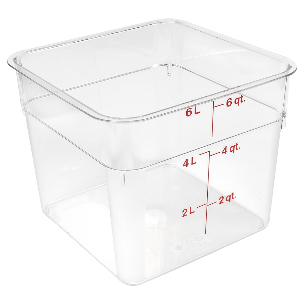 The Cambro 6SFSCW135 Camwear CamSquare food container has a 6-quart capacity. It is made of polycarbonate, so it resists odors and stains while the clear material allows visibility of product. Red graduation markings provide an easy way to keep up with inventory. The Cambro 6SFSCW135 Camwear CamSquare food container stacks with other pans to create more storage space.