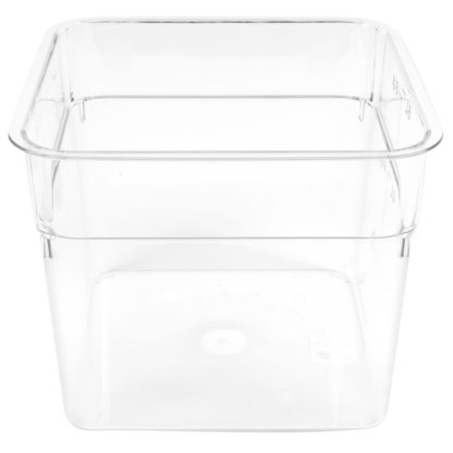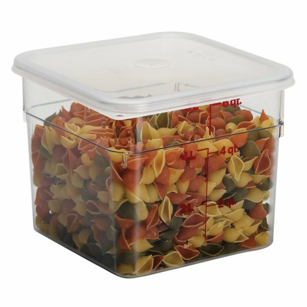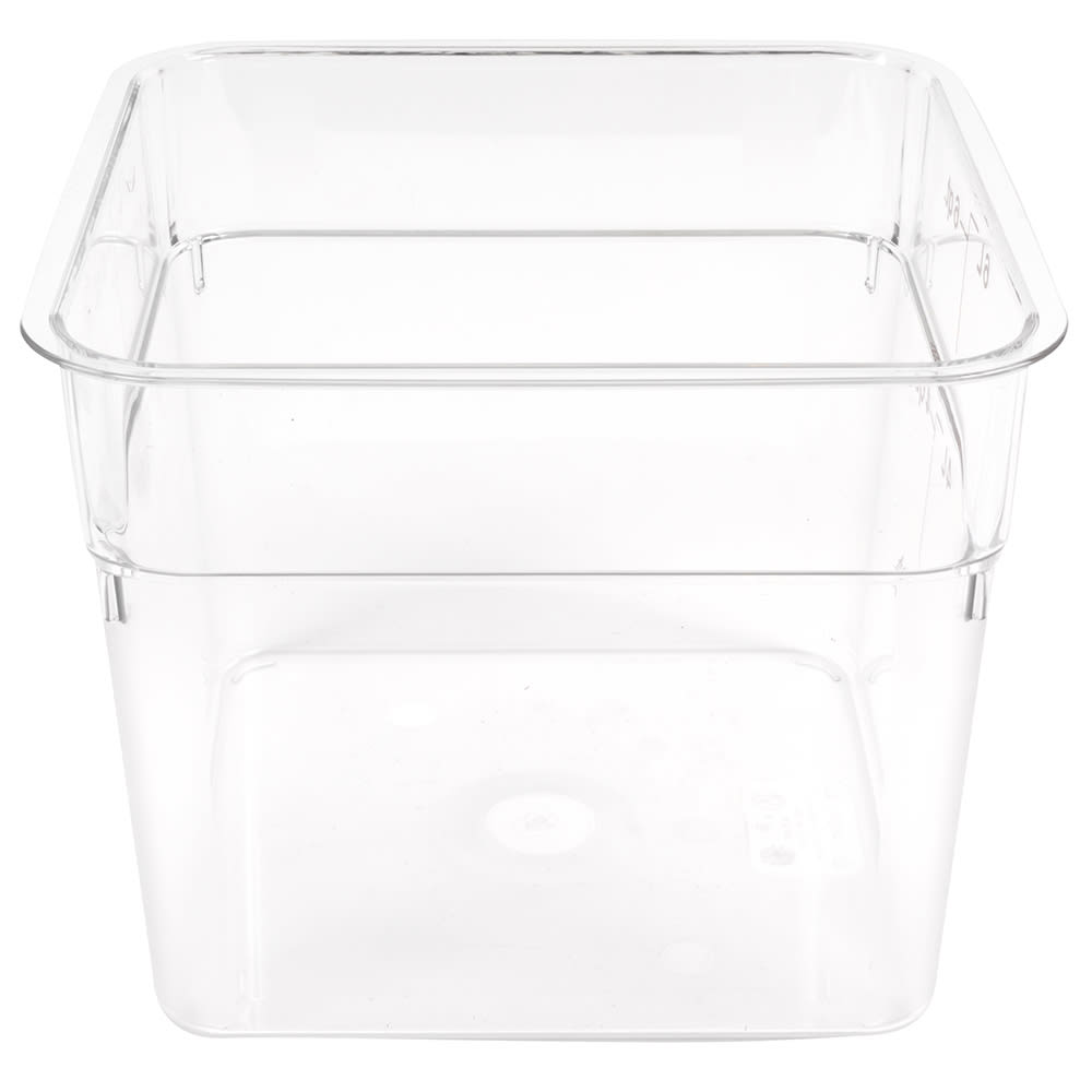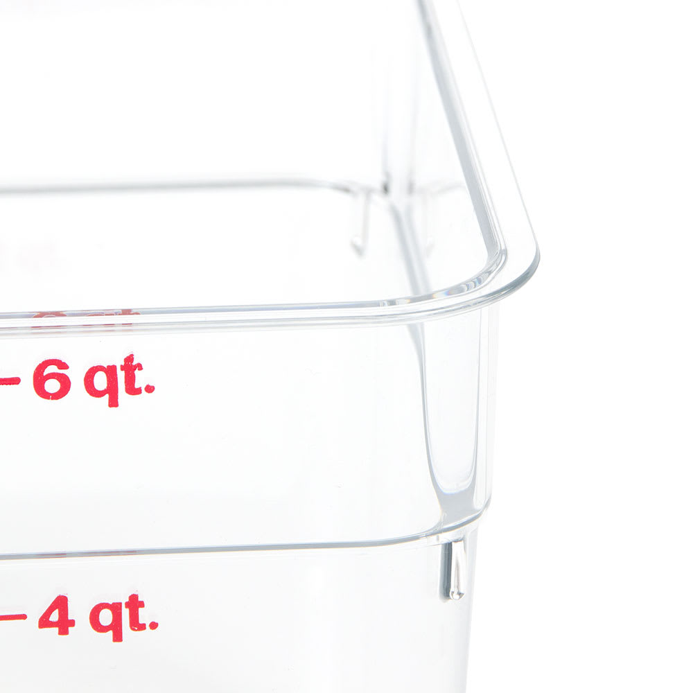 The Cambro 6SFSCW135 Camwear CamSquare food container has a 6-quart capacity. It is made of polycarbonate, so it resists odors and stains while the clear material allows visibility of product. Red graduation markings provide an easy way to keep up with inventory. The Cambro 6SFSCW135 Camwear CamSquare food container stacks with other pans to create more storage space.