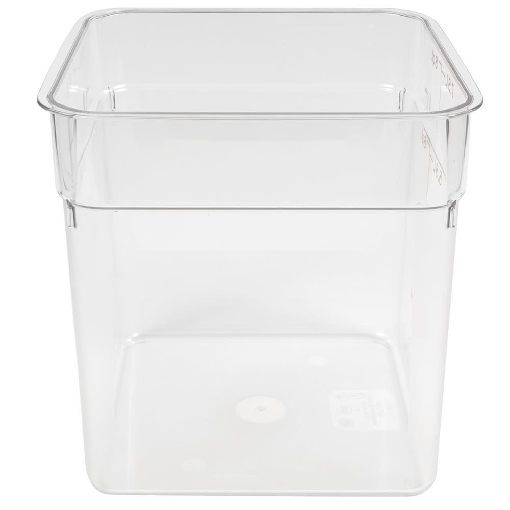 The Cambro 8SFSCW135 Camwear CamSquare food container has an 8-quart capacity. Graduated measurement marks enable staff to accurately portion and prep ingredients. The material is crystal clear, so users can see inside the dish and keep track of inventory. Made of polycarbonate, the container is resistant to bending, breaking, and cracking. With its square shape, the container fits inside reach-in and walk-in units. The Cambro 8SFSCW135 Camwear CamSquare food container can be stacked with other dishes to maximize storage space.
