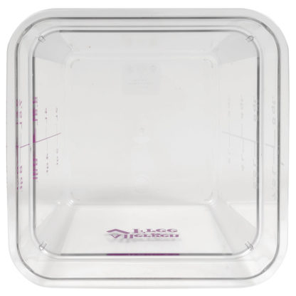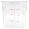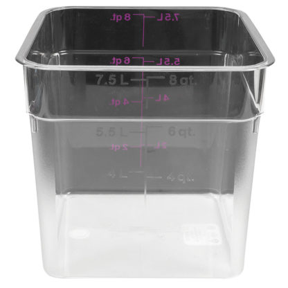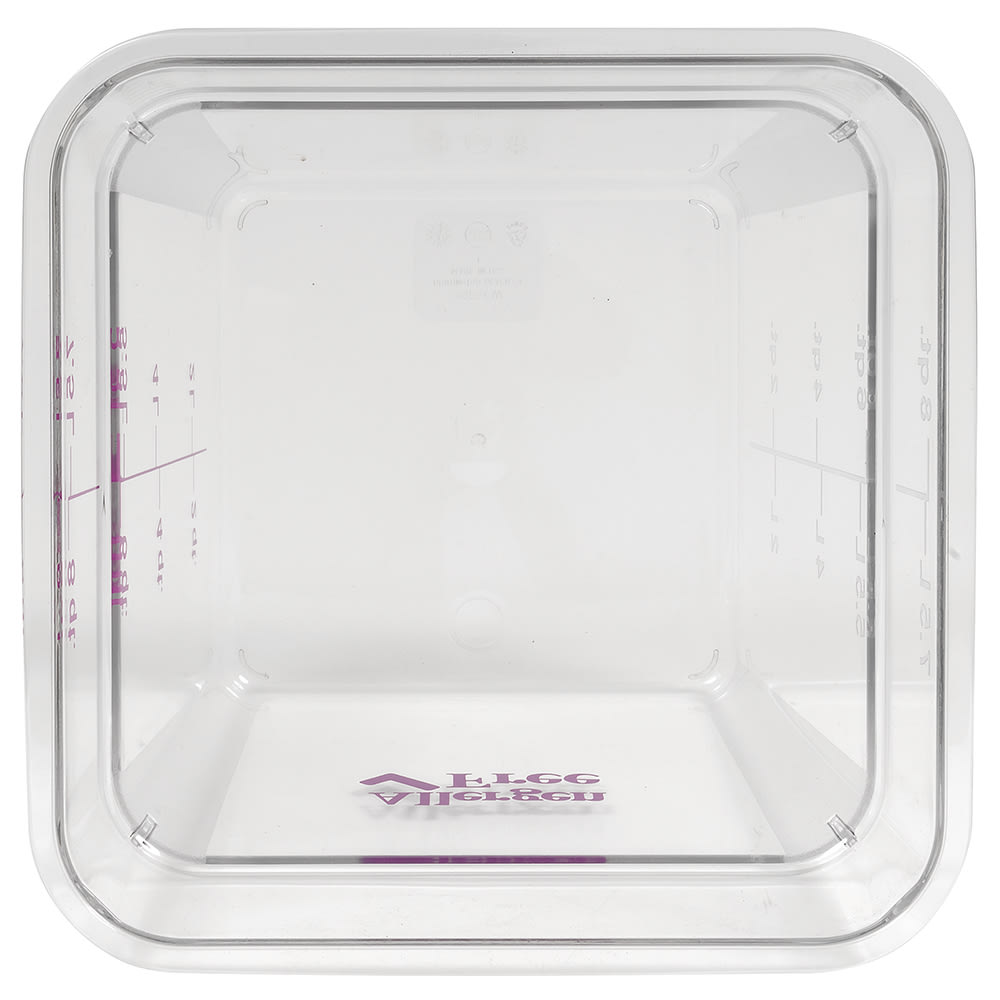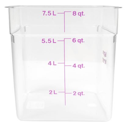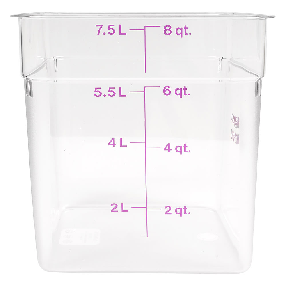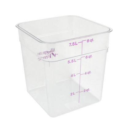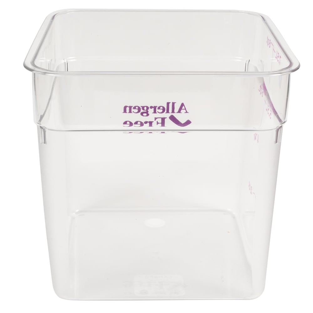 “Allergen Free” is printed in purple on the Cambro 8SFSCW441 CamSquare food container to prevent cross contamination. Made of durable polycarbonate, this container can be used in temperatures between -40 and 210 degrees Fahrenheit and resists acids, stains, and odors. Printed graduations help users measure product correctly, while the container’s transparent material provides a clear view for quick identification. To ensure sanitization for future use, it can be washed in a dishmachine. Overall, this container measures 83/8 inches long by 83/8 inches wide by 91/8 inches high and has an 8-quart capacity.