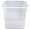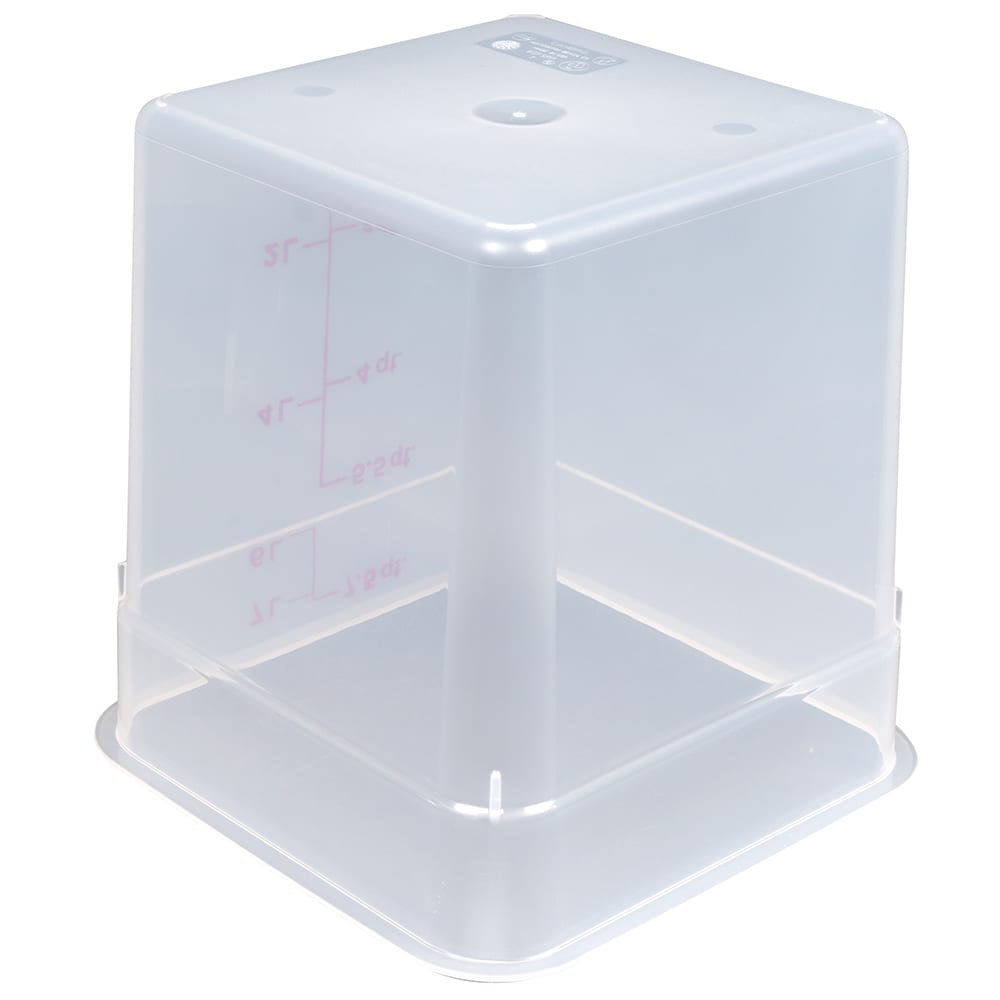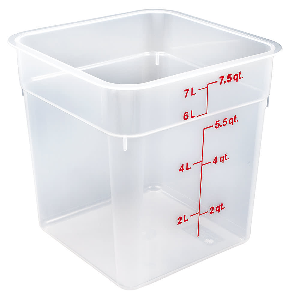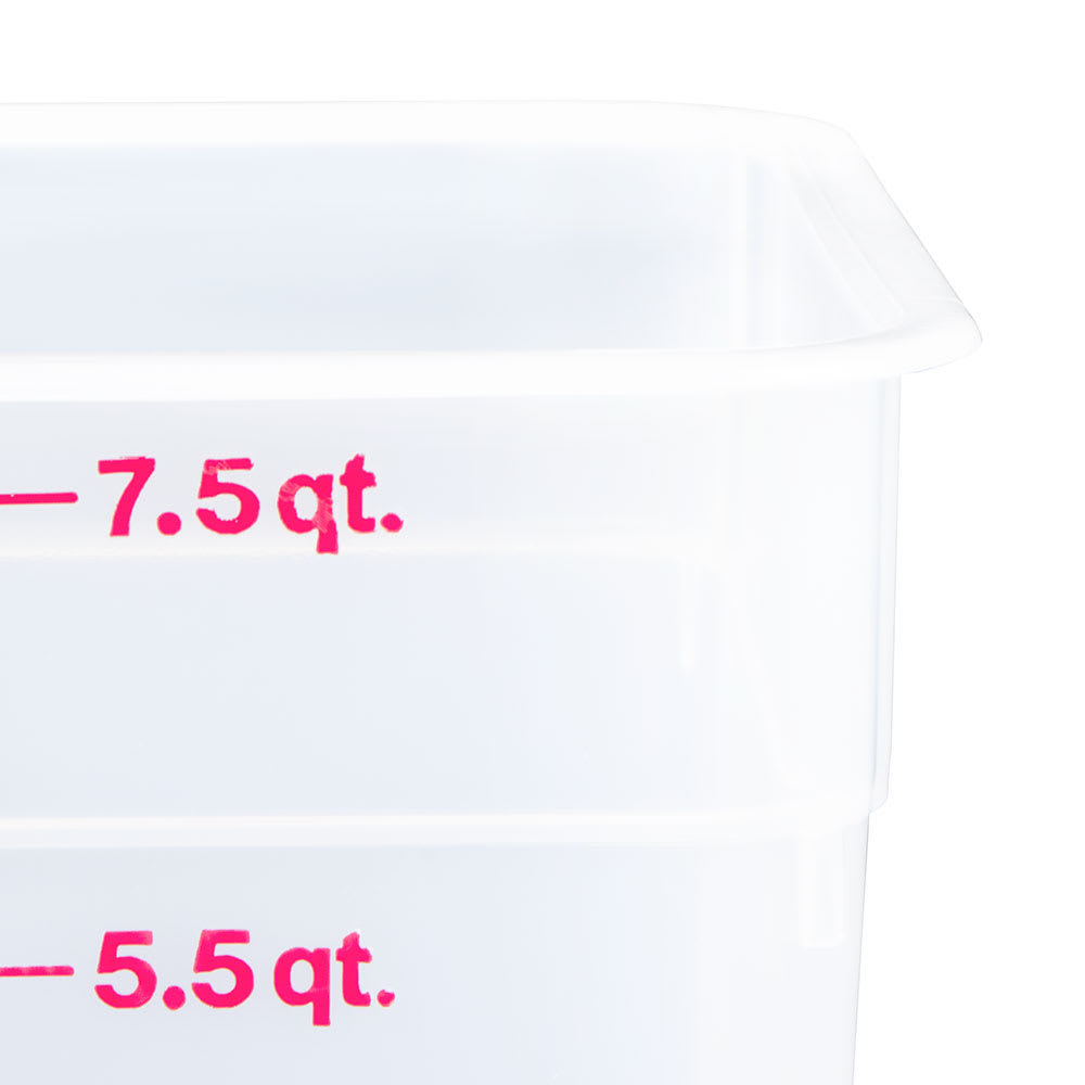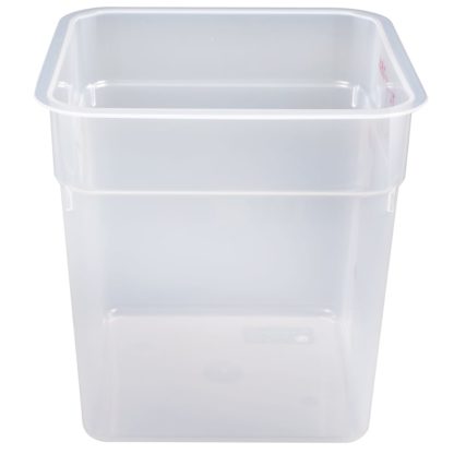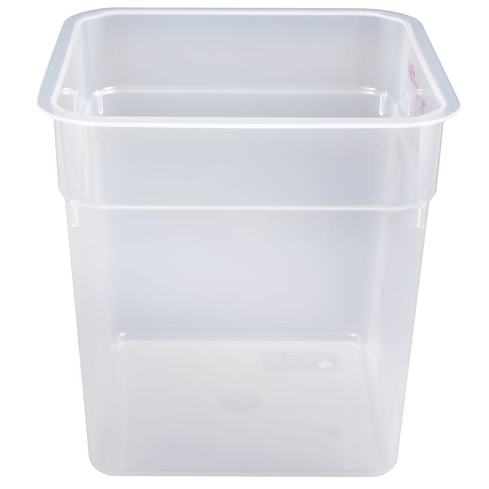 The Cambro 8SFSPP190 CamSquare food container is made of polypropylene, so it resists minor damage like bending, chipping, and cracking. This material is safe in the dishwasher and is translucent, enabling staff to easily check product. It is simple to portion and prep ingredients from the container since there are measurement graduations on its side. This Cambro 8SFSPP190 CamSquare food container has an 8-quart capacity.