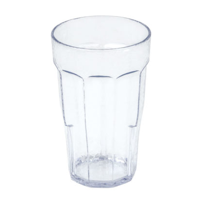 The Cambro LT14152 Laguna tumbler is made of impact-resistant SAN plastic with a 14-ounce capacity. It endures temperatures from -4 to 185 degrees Fahrenheit. It has a clear, light material and hammered texture to diminish appearances of scuff marks and water spots.