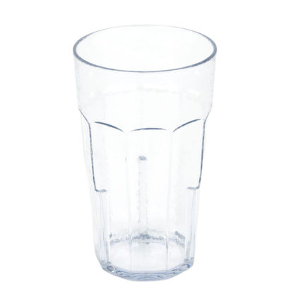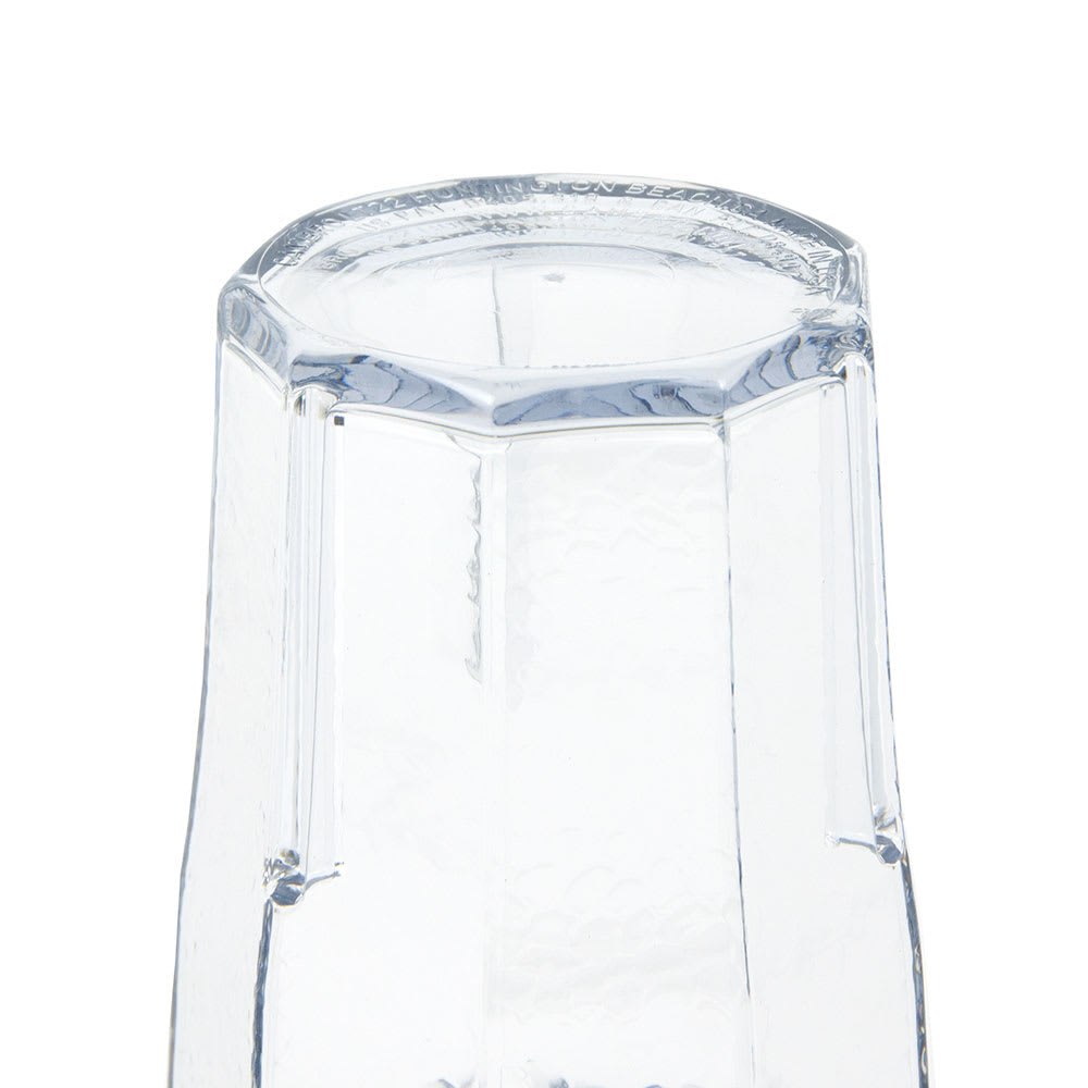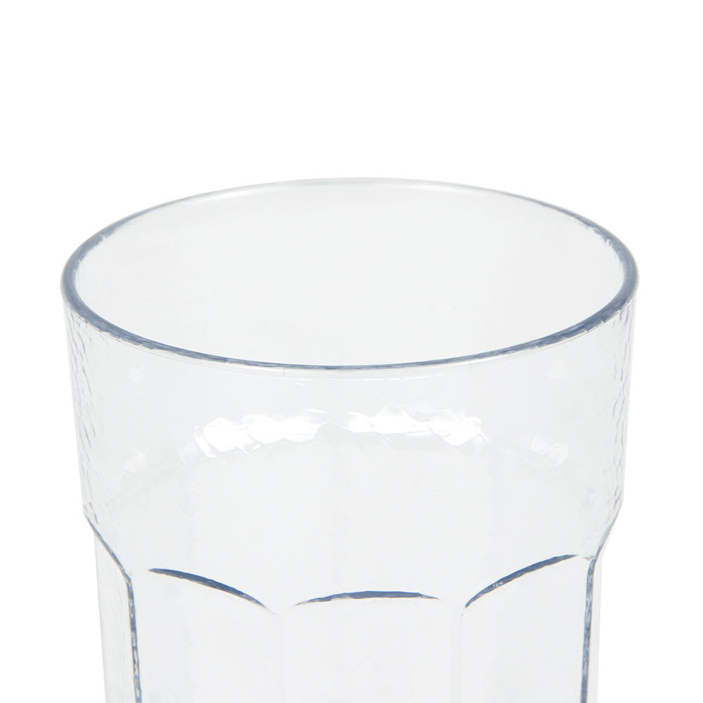 The Cambro LT22152 Laguna tumbler looks and feels like glass, but it will not easily chip or break since it is made of SAN plastic. This clear tumbler enables servers to easily see when refills are needed, and it has a hammered texture that can help hide water spots and scratches. With this texture, the Cambro LT22152 Laguna tumbler also catches light to highlight the drinks it holds. It has a 22-ounce capacity when the liquid is poured to the rim.