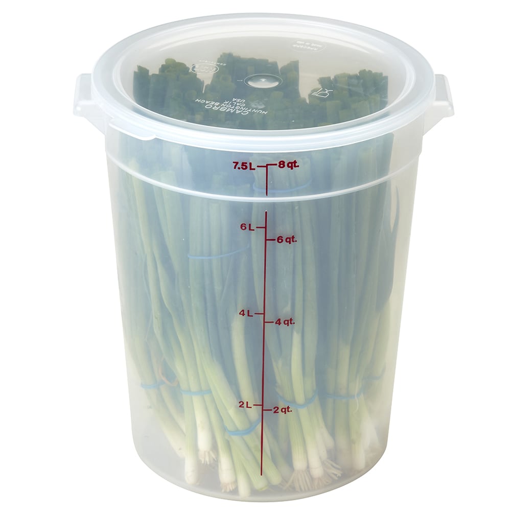 The Cambro RFS8PP190 food storage container is made of polypropylene to help prevent scratches and stains. Its translucent material enables users to partially view ingredients, and it withstands temperatures from -40 to 160 degrees Fahrenheit. For quick identification, graduations are marked on the exterior, and the container has an 8-quart capacity.