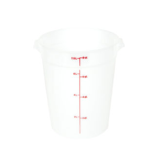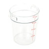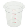 The Cambro RFSCW4135 Camwear storage container has a 4-quart capacity and is made of polycarbonate to resist stains and odors. Its clear material makes contents visible, and the graduations on the outside let the user easily check inventory. To support sanitary drying, its handles have holes built in. This container can be stacked to save space.