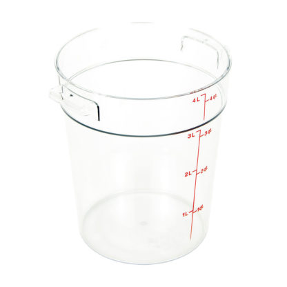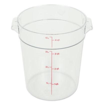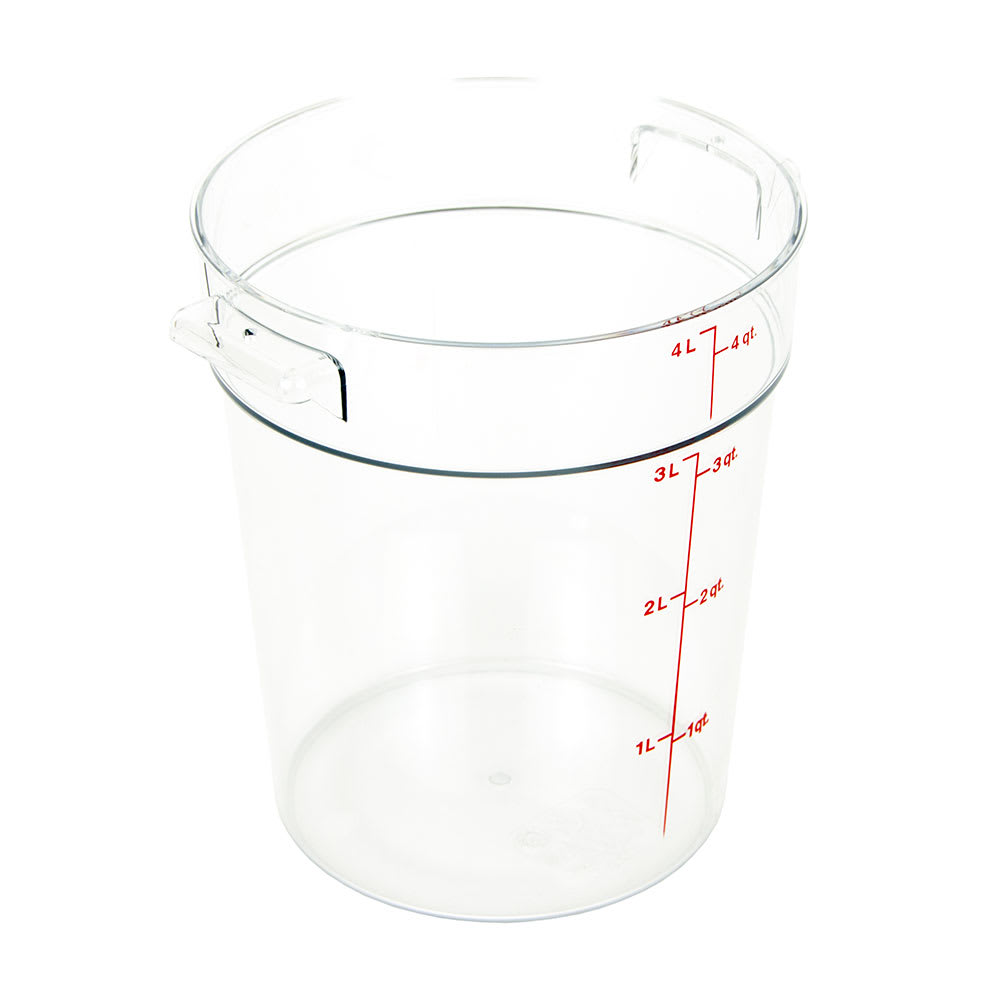 Camwear Storage Container, round, 4 qt., 8-3/16″ dia. x 8-9/16″H, withstands temperature of -40° F to 210° F, stain resistant, molded-in handle, durable polycarbonate construction, (covers sold separately), clear, NSF