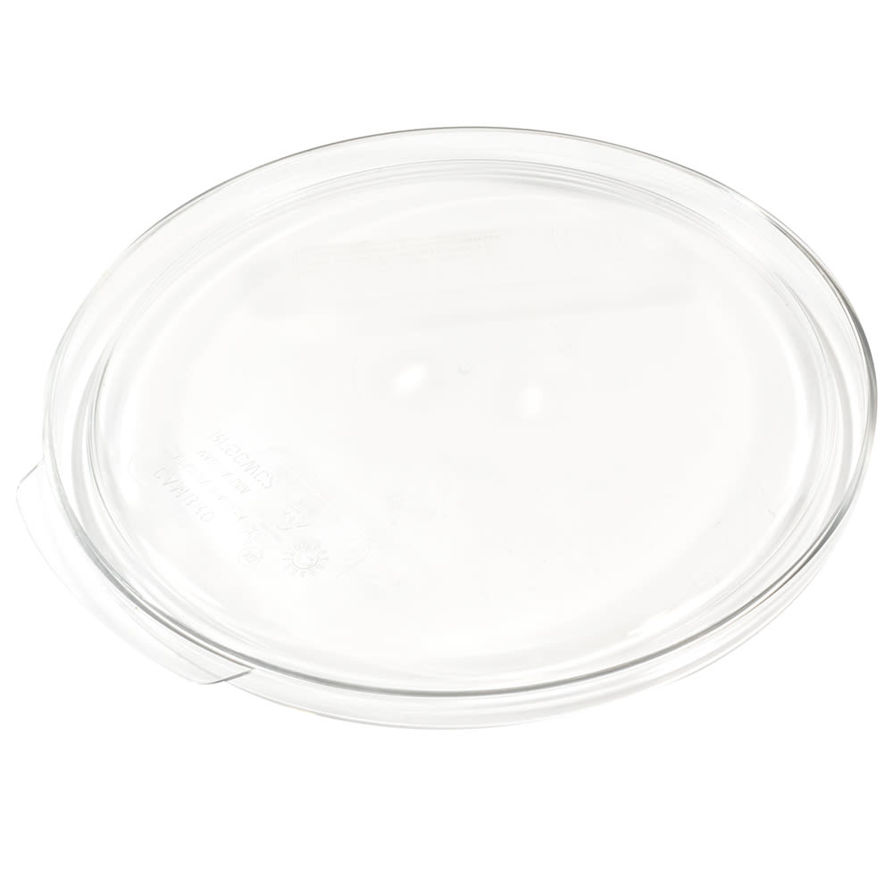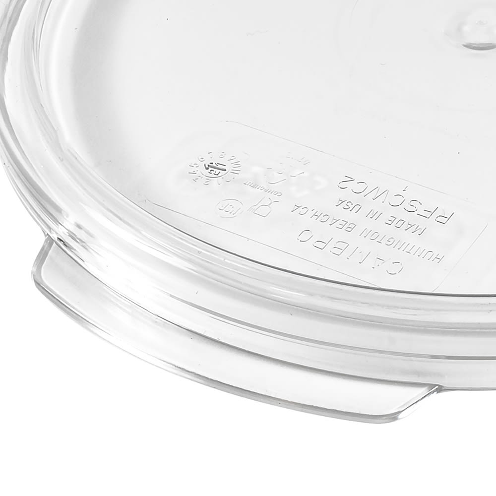 The Cambro RFSCWC2135 Camwear container lid is made of clear polycarbonate, which resists stains. It endures temperatures from -40 to 210 degrees Fahrenheit and snaps onto a container to minimize spills and protect its contents. It is compatible with Cambro 2- and 4-quart containers.