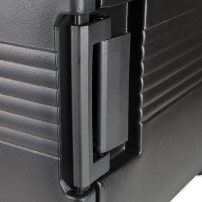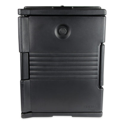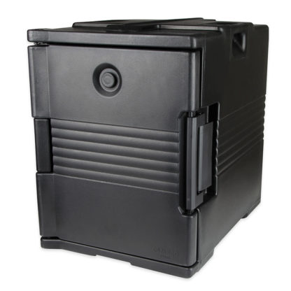 Camcarrier Ultra Pan Carrier, front loading, one-piece poly shell, foam insulation, holds 1/2, 1/3 & full size pans 2-1/2″ to 8″ deep, approximate capacity 60 qt., molded-in handles, nylon latch, air-tight gasket, vent cap, stackable, dishwasher safe, black, NSF
