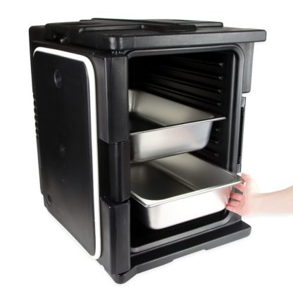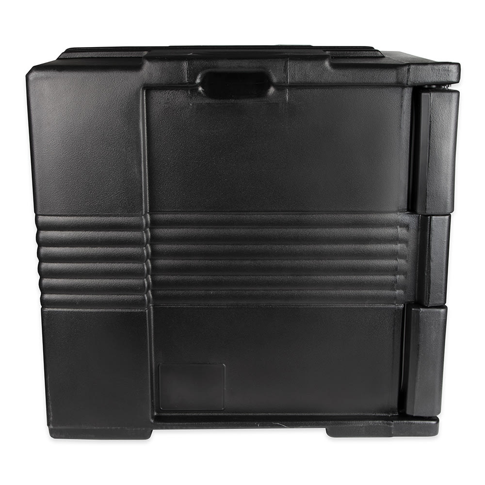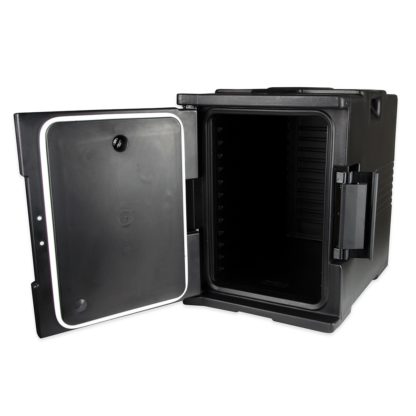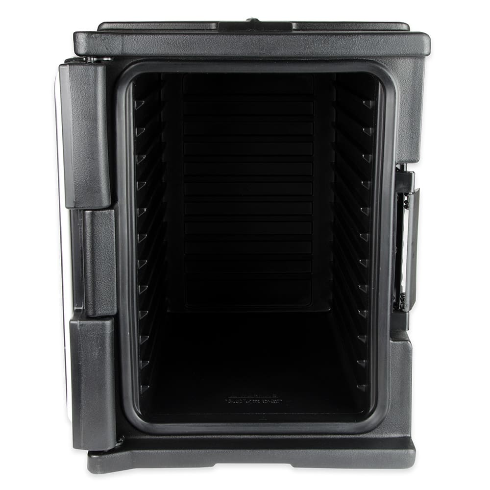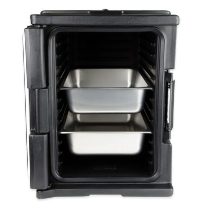 Keep your food secure and at safe temperatures during transport with this Cambro UPC400110 Ultra Camcarrier front loader pan carrier with a 60 quart capacity. Constructed with a one-piece polyethylene shell, this front-loading food carrier is fully insulated to maintain safe temperatures. Its air-tight gasket locks in temperatures so that your foods stay fresher and hotter for longer. This pan carrier holds half-, third-, and full-size pans and is stackable for storing and moving a large amount of food at once. The molded-in handles, nylon latch, and built-in seal provide the best in food carrier security so that you never have to worry about accidents or spills. Its black finish looks professional and will easily hide scratches and stains. The door on the Cambro UPC400110 Ultra Camcarrier front loader pan carrier opens 270 degrees the side so loading and unloading the carrier is simple.