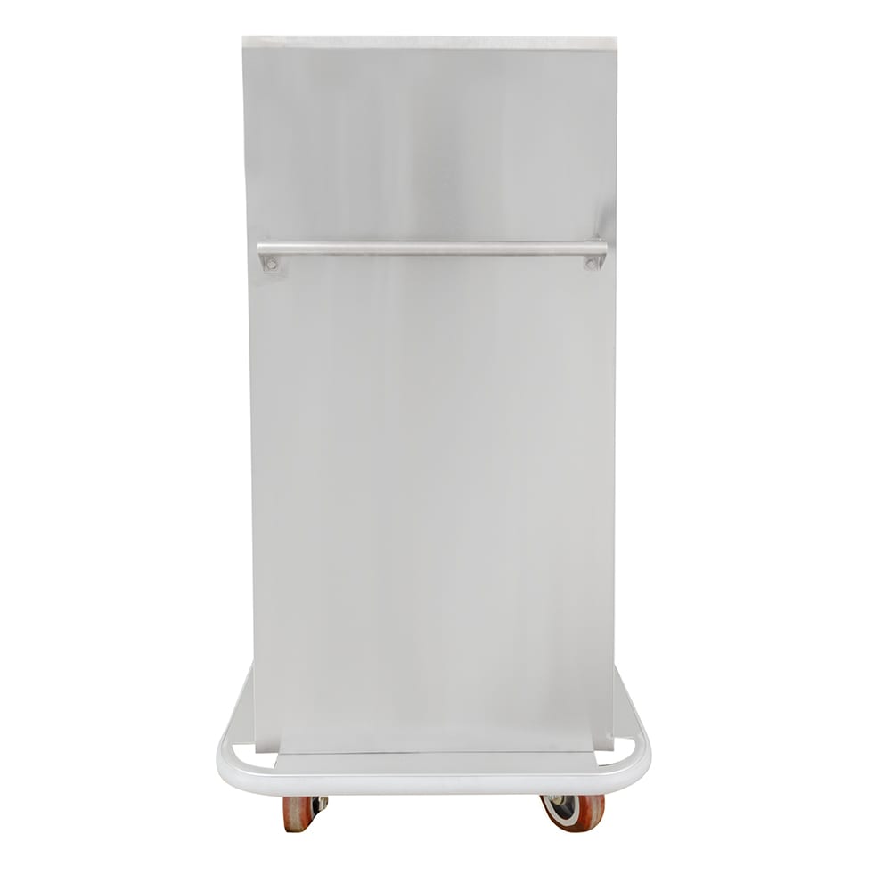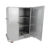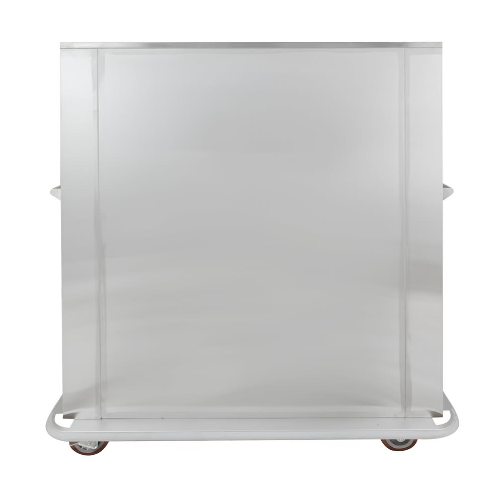 When the unit needs to be moved, the doors can be secured with sliding latches, and employees can maneuver the cart using the horizontal end handles. The casters have a 6-inch diameter and polyurethane treads, so they stay quiet and absorb the vibrations of travel. An extruded aluminum bumper with a non-marking vinyl inset surrounds the bottom edge of the cabinet, reducing the risk of dents and damage. The Carter-Haffman BB150 banquet cart is constructed of stainless steel for durability and warp resistance. To keep employees safe, its edges have been welded, and any sharp seams have been turned inwards.