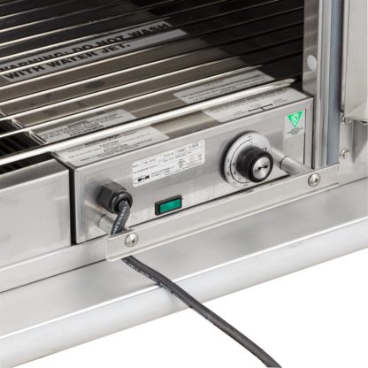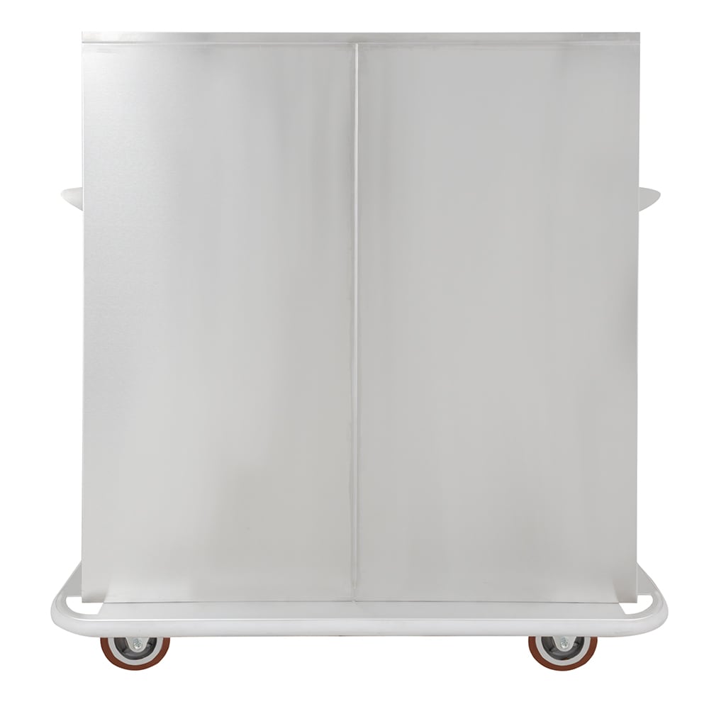 This banquet cabinet is mounted on 6-inch, offset casters that roll over uneven surfaces, and its horizontal end handles provide a steady grip when turning corners. Two locking casters keep the unit in place. With folded edges and a stainless steel construction, this Carter-Hoffmann BB96 heated banquet cabinet is simple to clean.
