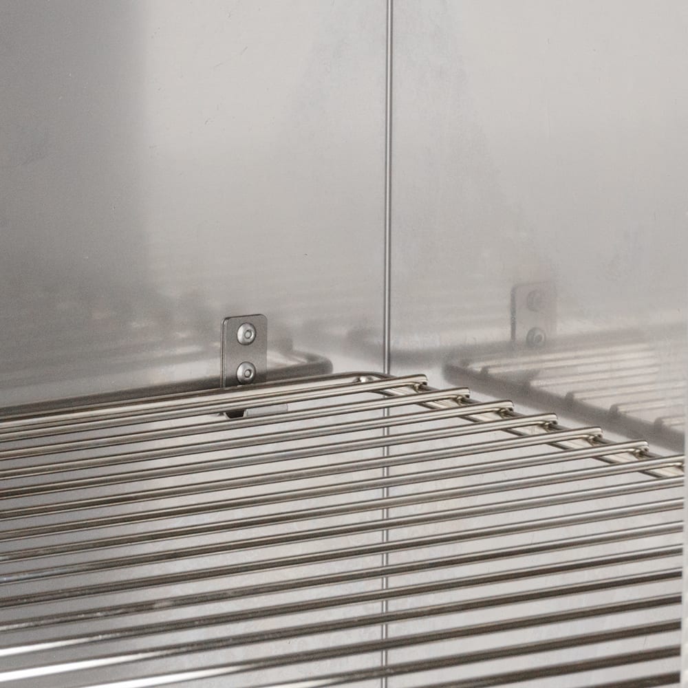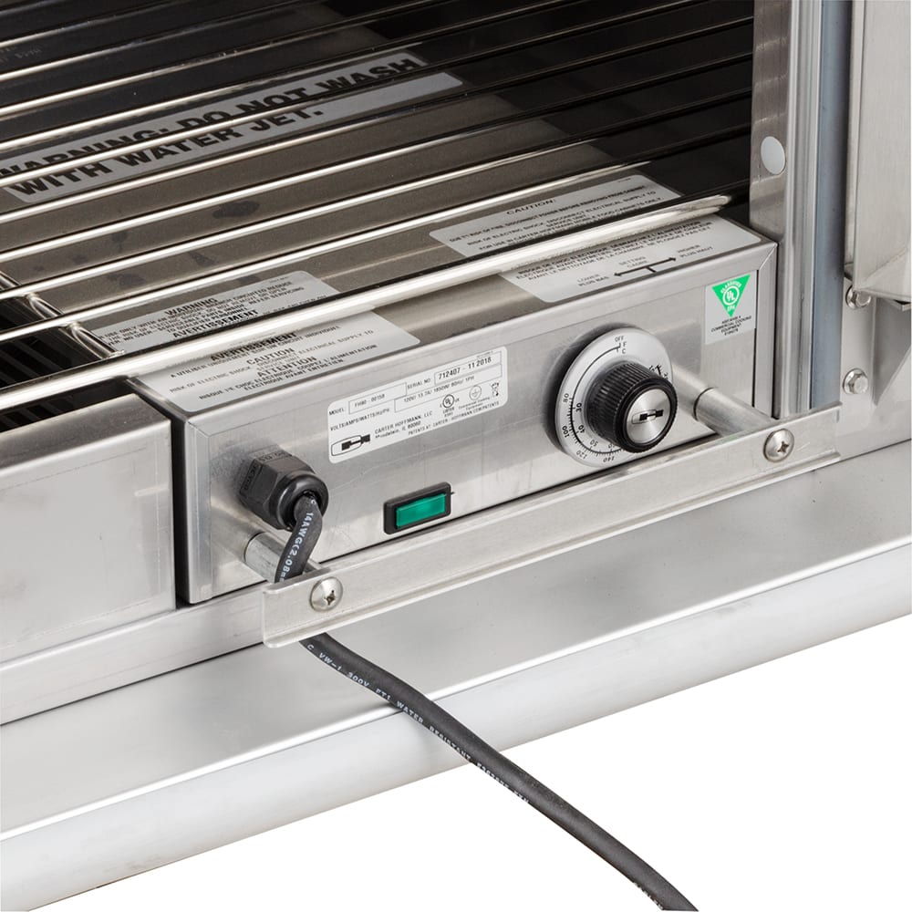 The Carter-Hoffmann BB96 heated banquet cabinet can warm up to 160 degrees Fahrenheit in only 20 minutes and holds as many as 120 plates at safe temperatures. The 1-inch-thick fiberglass insulation and double-wall stainless steel construction of the cabinet helps keep heat inside. Around the door frame, a silicone gasket blocks out ambient air and increases holding times. To keep food safe during transport, sliding latches secure the doors, and a bottom bumper absorbs impacts.