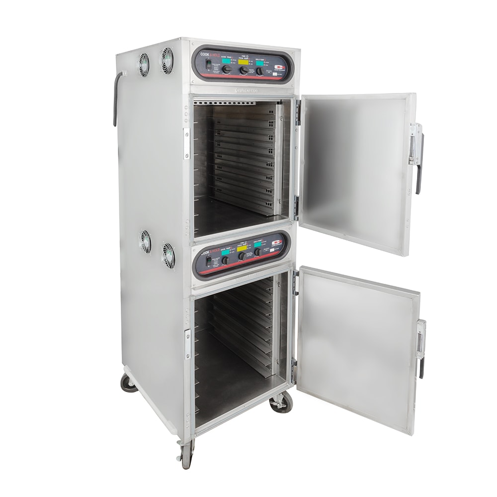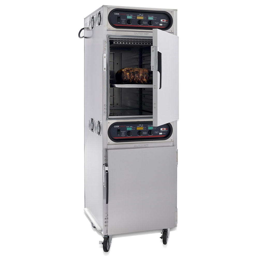 The Carter-Hoffmann CH1600U full-size cook-and-hold oven can reach 325 degrees Fahrenheit using separate cook and hold controls. It has a top-mounted blower heater to ensure cooking is uniform, and a heat duct is mounted on the side to caramelize product and seal in natural food juices, increasing flavor. When cooking is complete, this unit holds the food between 100 and 200 degrees Fahrenheit to maintain proper serving temperatures, and to ensure heat stays inside the cabinet, it is insulated with high-density fiberglass.